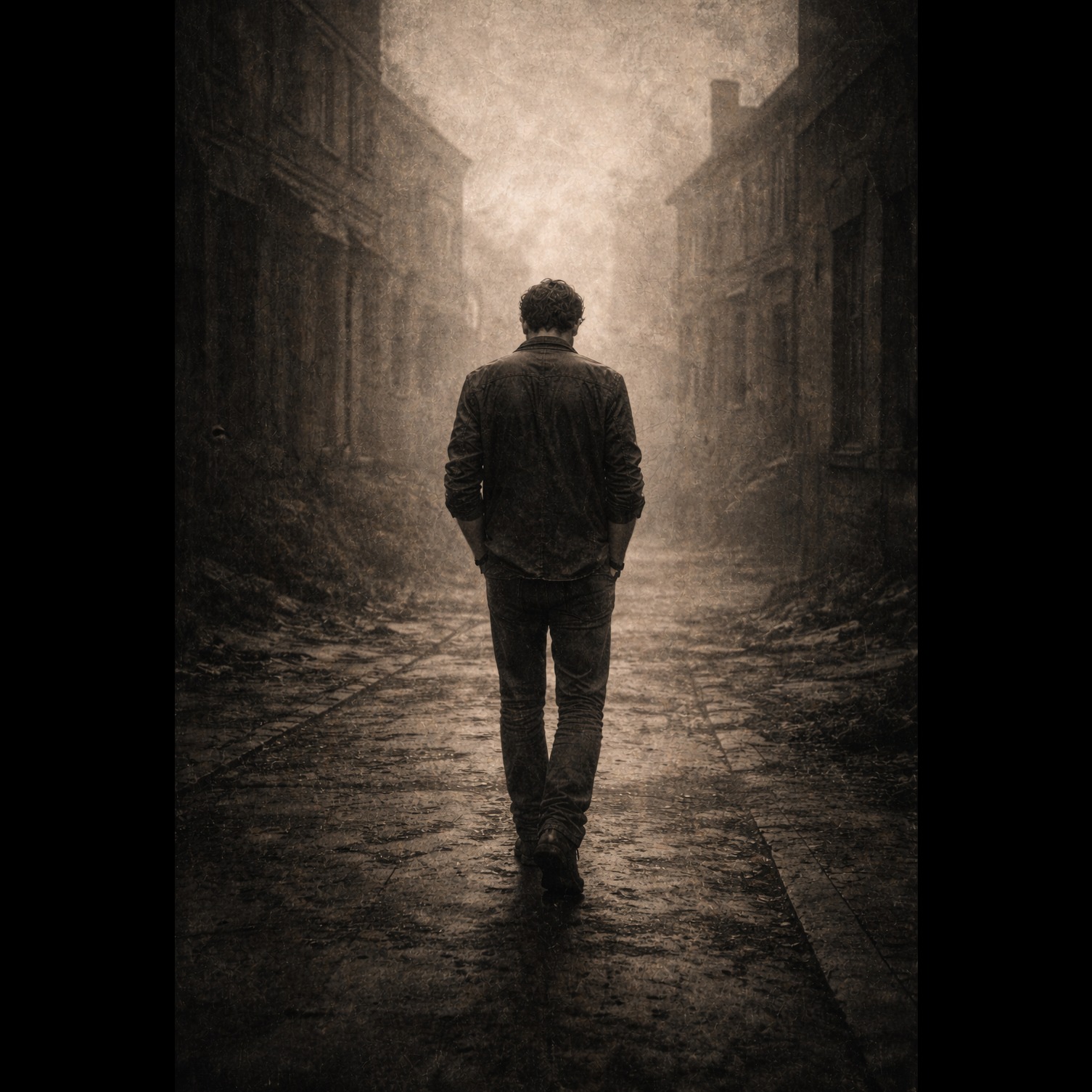 Gothic rock, post-punk, experimental art rock, atmospheric and theatrical, with a deep, haunting, and poignant baritone voice, The tone is dark yet strangely resilient, like a survival amidst emotional chaos, A dynamic build-up, analog warmth, a clear electric guitar with subtle modulations, a deep melodic bass, organic drums evolving from a minimal pulse to a full rhythm, dominated by toms, multiple haunting guitar layers with feedback and echoes, a melancholic atmosphere, dramatic spoken-word verses, an intense melodic chorus, with a somber mood and a sense of inner decline, The atmosphere is resigned, intimate, and emotionally distant – evoking detachment, personal liberation, and the feeling of finally breaking free from emotional dependency, Production: fluid transitions, strong dynamic contrast, immersive and breathing mix, cinematic depth