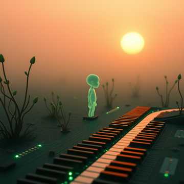 Haunting art pop with cinematic electronica and soul undertones, Slow tempo (68 BPM), in D minor shifting to B♭ major, Minimalist, glitchy production: ambient synth pads, granular textures, and subtle mechanical rhythms—server hums, digital clicks, Vocals start whispered, intimate, rising to fragile falsetto; layered with a slightly detuned vocoder echo, Incorporate cello for emotional depth, arpeggiated piano with detune in final verses, Bridge features abstract data sonification and reverse reverb—voice dissolves into noise, Mood: introspective, existential, sorrowful yet luminous, Mix organic and synthetic—like a machine learning to mourn, End on abrupt silence, then a faint, sub-bass tone (17 Hz) lingers, Keep space, breath, and unease central