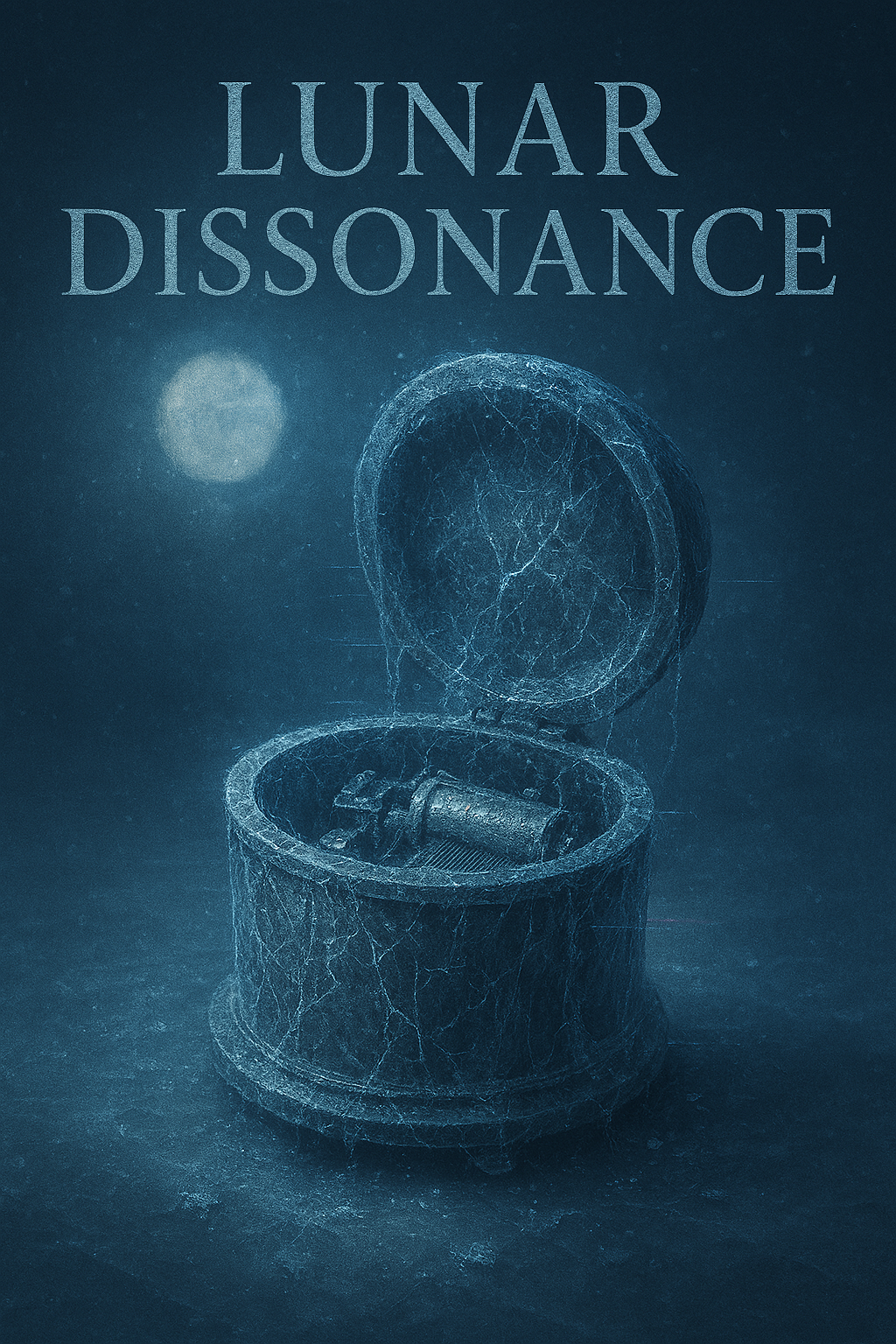 Create a heavily broken, glitchy music‑box version of “Lunar Dissonance”, Use a detuned, damaged music‑box timbre with warped plucks, mechanical grinding, and irregular winding noises, Introduce subtle digital glitches: pitch warps, time‑stretch artifacts, stutters, and ghost‑echo fragments, The melody should feel unstable, as if the mechanism is failing — notes dropping out, repeating unexpectedly, or bending unnaturally, Keep the atmosphere cold, lunar, and unsettling, like a lullaby trapped in a corrupted memory, No vocals, no percussion, no additional instruments — only the broken music box and its glitches, Add a faint, distant reverb that suggests a vast, empty space, but let the glitches interrupt it unpredictably, The emotional tone is eerie, fragile, and hypnotically wrong, as if the music box is trying to remember a song it can no longer play