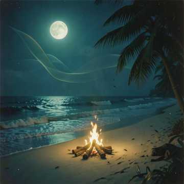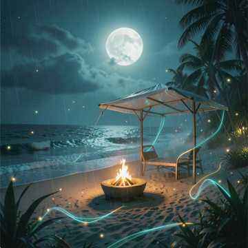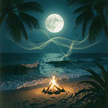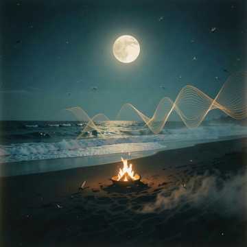 Sleep music, waves crashing, lush synth pads, night time insects lightly buzzing, fire crackling