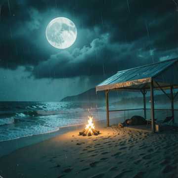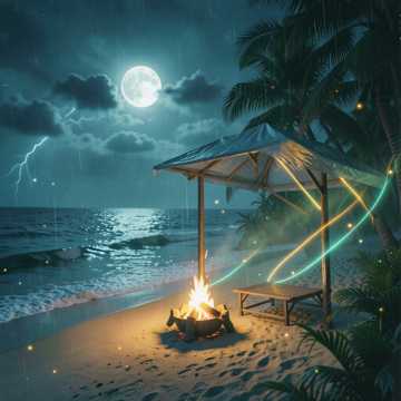 Sleep music, waves crashing, lush synth pads, night time insects lightly buzzing, fire crackling, thunder in the distance, rain on a plastic roof