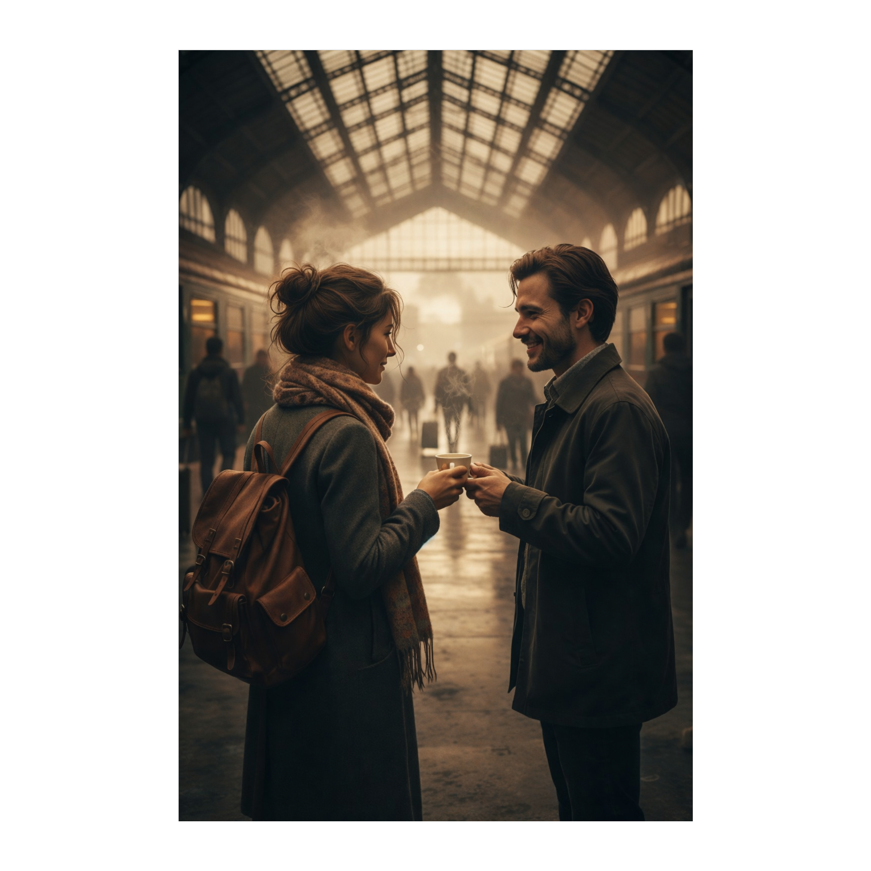 Modern French chanson with warm, male vocals, Emotional, intimate, slightly nostalgic but contemporary, Orchestral arrangement with soft strings, piano, light brushed drums, subtle accordion textures, Add modern production touches like gentle reverb, wide stereo, and clean mix, Include lush backing vocals in the chorus for lift, chorus with harmonized vocals, The music should support storytelling and fit lyrics about dawn, colors, memories, shared paths, and a tender, growing love, Smooth transitions, expressive phrasing, and a heartfelt, cinematic atmosphere