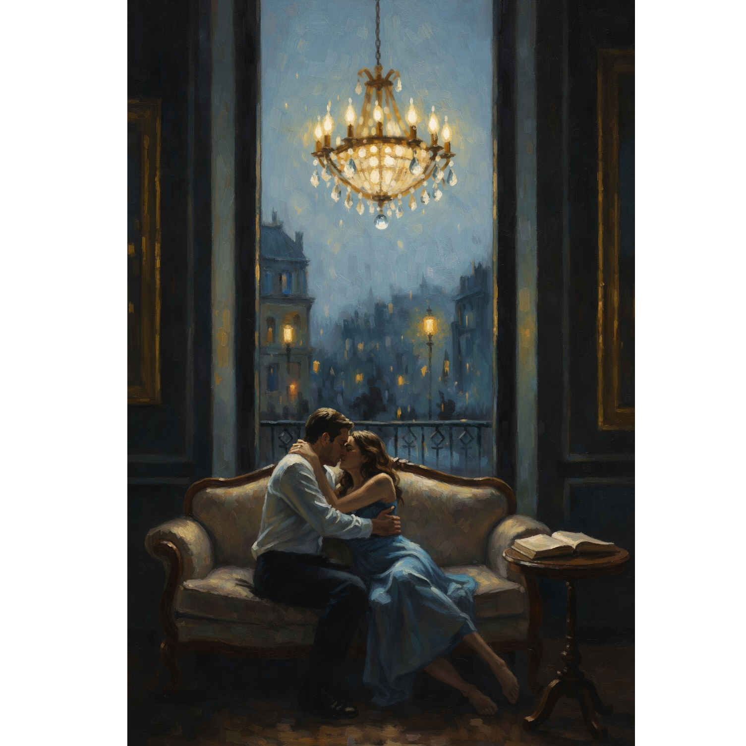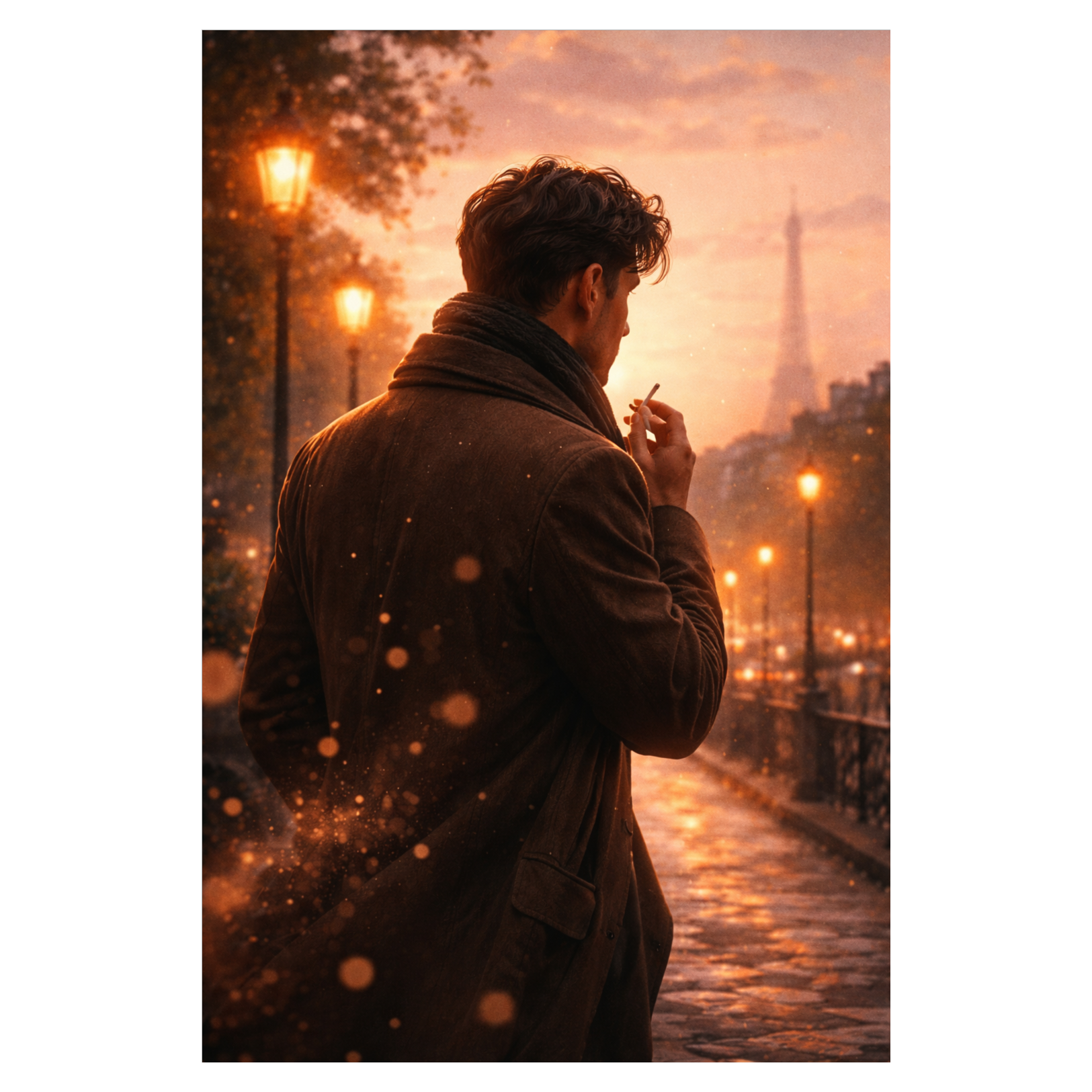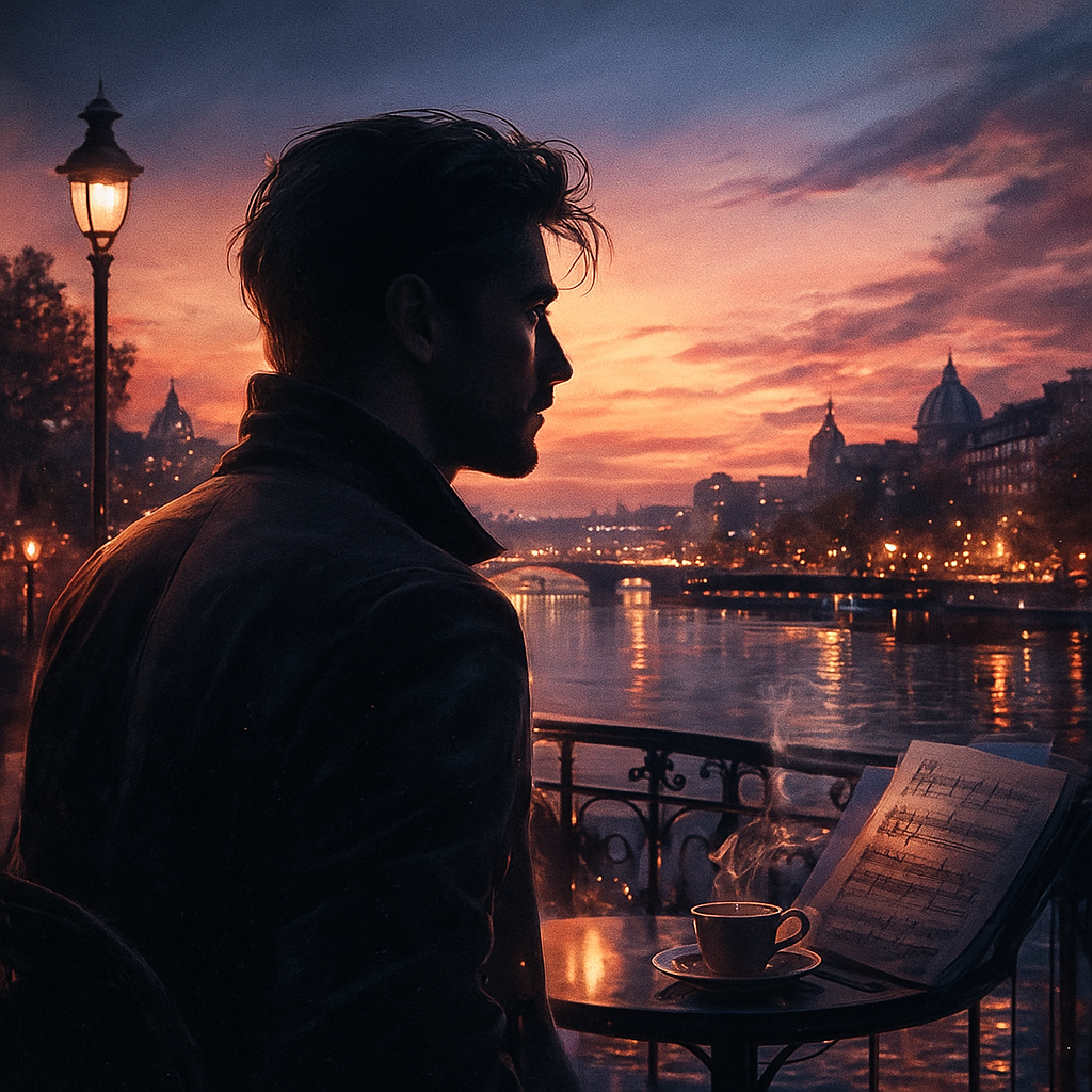 The chanson opens with grand piano delicately tracing rubato chords, joined by cinematic strings for atmosphere, brushed drums add subtle movement, Male tenor vocal—breathy, expressive, and punctuated by fragile falsetto—use dynamic pauses and nuanced phrasing, Chorus with harmonized and backing vocals and Full vocal arrangement, wide soundstage, intensifying the noir, high-fidelity mood while gentle dynamic shifts give the arrangement a sense of intimacy and cinematic depth
