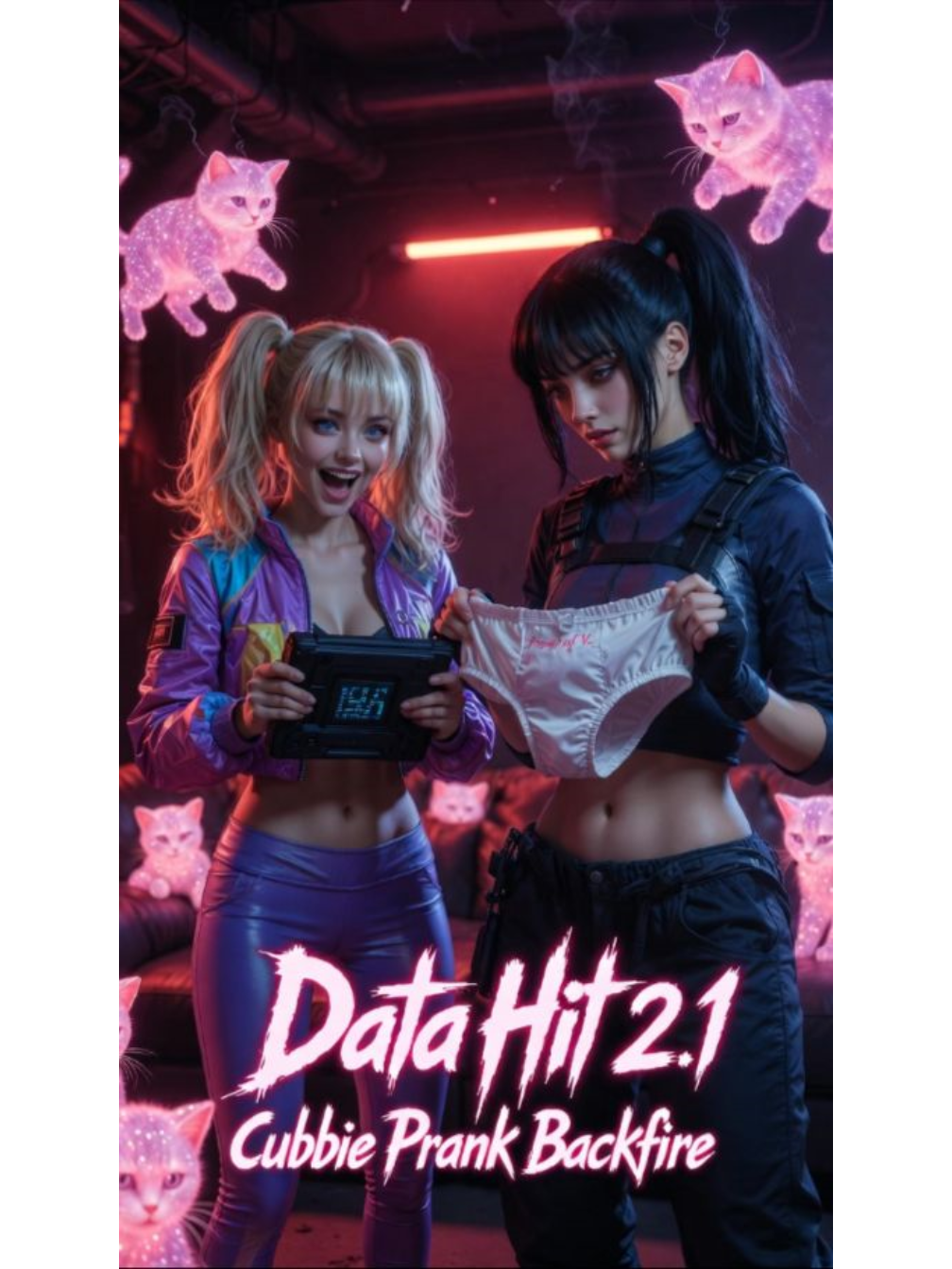 Cyberpunk synthwave with dark retro 80s vibes mixed with chaotic kawaii hyperpop elements, deep pulsing analog synth bass, shimmering arpeggiated leads, distorted retro drum machines, subtle anarcho-punk guitar accents in the background, female vocals shifting from sultry breathy verses to powerful echoing choruses, playful glitchy kitten meows layered in transitions, wet reverb-drenched percussion, subversive prank energy building to tense explosive drops, pristine high-fidelity production, direct instrumental or spoken intro, no melodic vocal start, precise vocal delivery from lyrics, ultra-clean production, pristine high-fidelity mastering, flawless crystal-clear mix, audiophile reference quality, absolutely no distortion, no hiss, no crackle, no background noise of any kind, no artifacts, no static, no tape hiss, no vinyl crackle, no digital glitches, Do not change any words inside brackets, Sing exactly as written, ‑male vocals, ‑fast tempo, ‑clean pop, ‑innocent vibe, ‑acoustic instruments, ‑country, ‑jazz, ‑lo-fi chill, ‑bright pads, ‑shy delivery, ‑background noise, ‑static, ‑hiss, ‑shimmer, ‑clicks, ‑pops, ‑floor noise, ‑distortion, ‑artifacts, ‑tape hiss, ‑vinyl crackle, ‑digital glitches, ‑low fidelity, ‑muddy mix, ‑unwanted reverb, ‑breathing noise, ‑intro humming, ‑oh oh ah ah, ‑melodic ad-libs, ‑vocalizations at start, ‑unnecessary scats