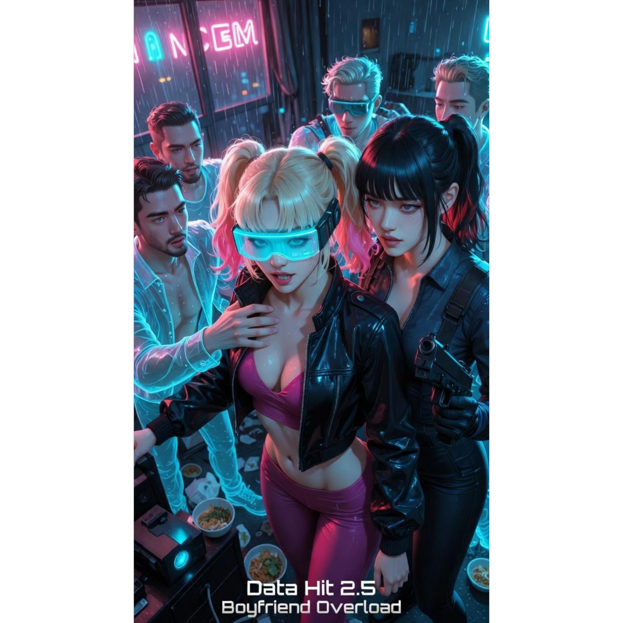 cyberpunk synthwave, 80s neon retro-futuristic, glitch-hop trap elements, playful chaotic female vocals, sultry ironic teasing delivery, pulsing deep bass, glitchy vocal chops & layers for boyfriend swarm effect, dramatic drops with orchestral brass accents, retro chrome sheen, high-energy comedy chaos vibe turning intimate at the end, subtle suggestive undertones, direct spoken/glitchy intro, no melodic vocal start, precise vocal delivery from lyrics, ultra-clean production, pristine high-fidelity mastering, flawless crystal-clear mix, audiophile reference quality, absolutely no distortion, no hiss, no crackle, no background noise of any kind, no artifacts, no static, no tape hiss, no vinyl crackle, no digital glitches, Do not change any words inside brackets, Sing exactly as written, ‑male vocals, ‑fast tempo, ‑clean pop, ‑innocent vibe, ‑acoustic instruments, ‑country, ‑jazz, ‑lo-fi chill, ‑bright pads, ‑shy delivery, ‑background noise, ‑static, ‑hiss, ‑shimmer, ‑clicks, ‑pops, ‑floor noise, ‑distortion, ‑artifacts, ‑tape hiss, ‑vinyl crackle, ‑digital glitches, ‑low fidelity, ‑muddy mix, ‑unwanted reverb, ‑breathing noise, ‑intro humming, ‑oh oh ah ah, ‑melodic ad-libs, ‑vocalizations at start, ‑unnecessary scats
