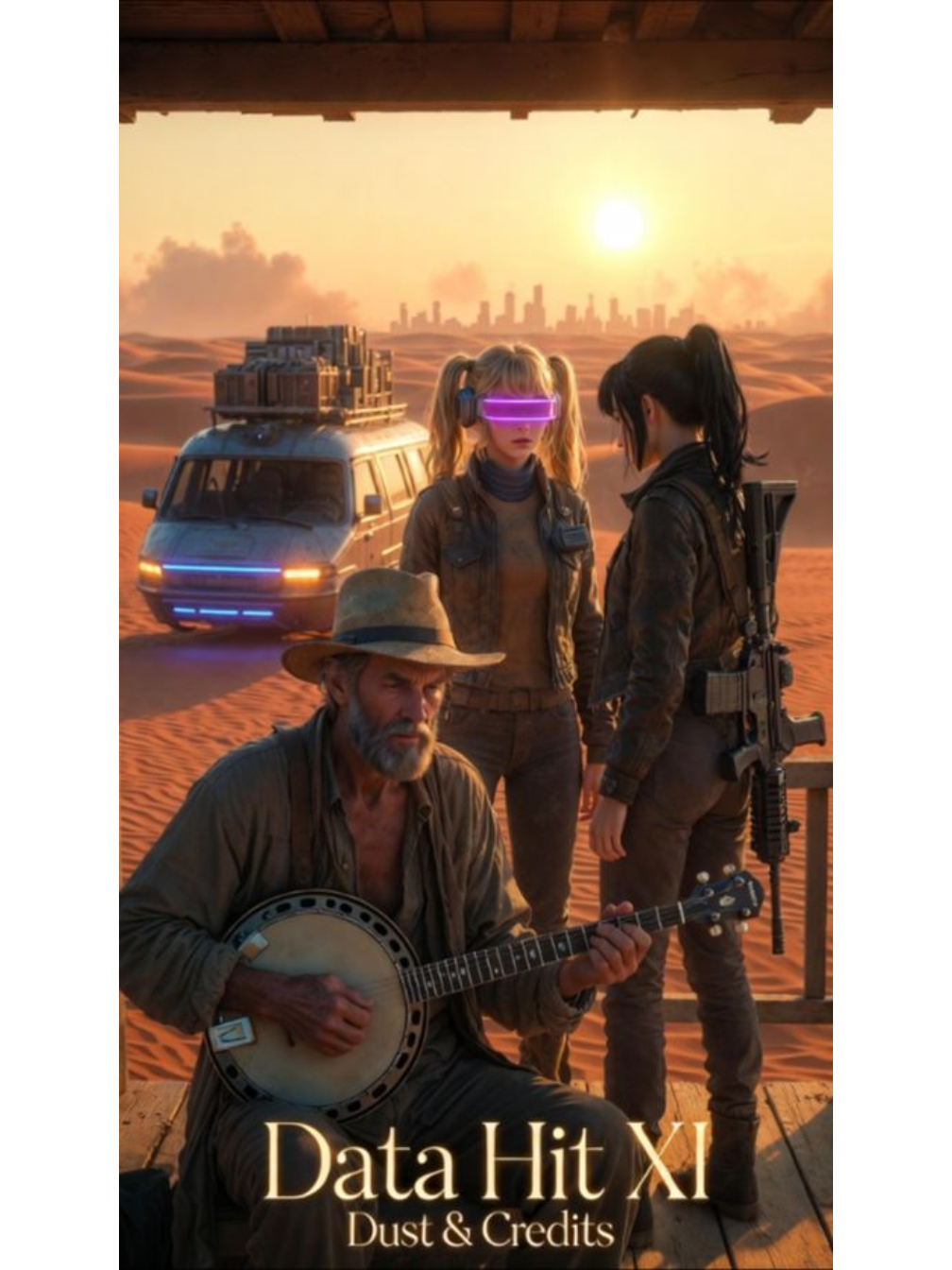 retro synthwave with acid-rock edge, warm analog polysynths, pulsing basslines, arpeggiated leads, overdriven fuzzy guitar riffs and psychedelic swells, occasional ironic banjo plucks and rolls for hillbilly contrast, chaotic humorous cyberpunk mood with retro drive, female vocals sarcastic-intimate to triumphant with light digital processing and reverb tails, spoken word intro only, direct instrumental/spoken intro no melodic vocal start, precise vocal delivery from lyrics, high-fidelity studio recording, polished professional production, pristine audio quality throughout, consistent mixing and levels, well-balanced mix, no degradation or quality drop towards the end, ultra-clean high-resolution mastering, no distortion at any point, no hiss crackle noise artifacts static tape vinyl digital glitches of any kind, Do not change any words inside brackets, Sing exactly as written, ‑male vocals, ‑fast tempo, ‑clean innocent pop, ‑acoustic country jazz lo-fi chill, ‑bright pads, ‑shy weak delivery, ‑background noise static hiss shimmer clicks pops floor noise distortion artifacts tape hiss vinyl crackle digital glitches low fidelity muddy mix unwanted reverb breathing noise intro humming melodic ad-libs vocalizations at start unnecessary scats, ‑volume jumps, ‑inconsistent levels, ‑degradation at end, ‑quality drop in final section
