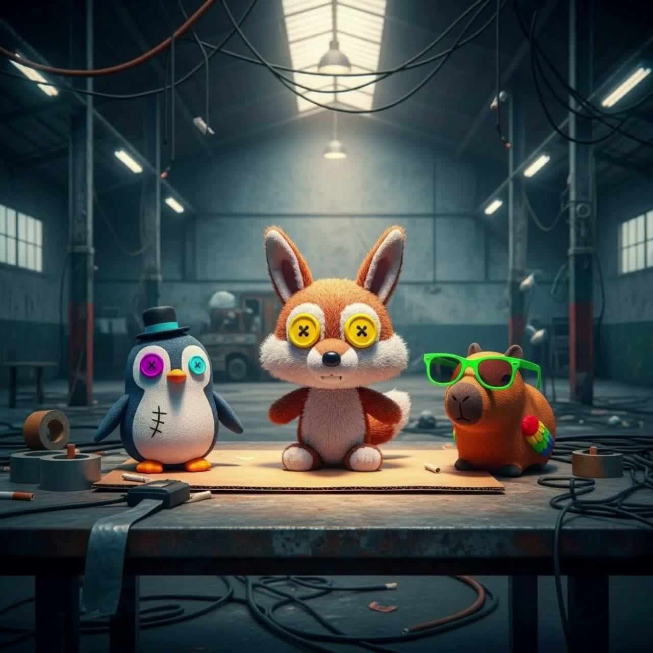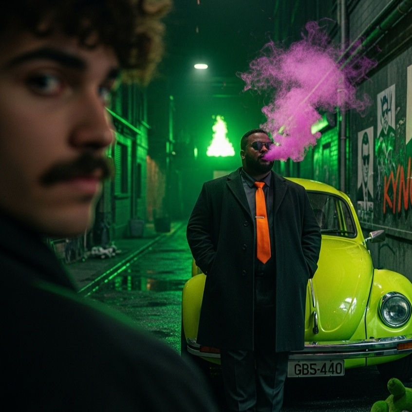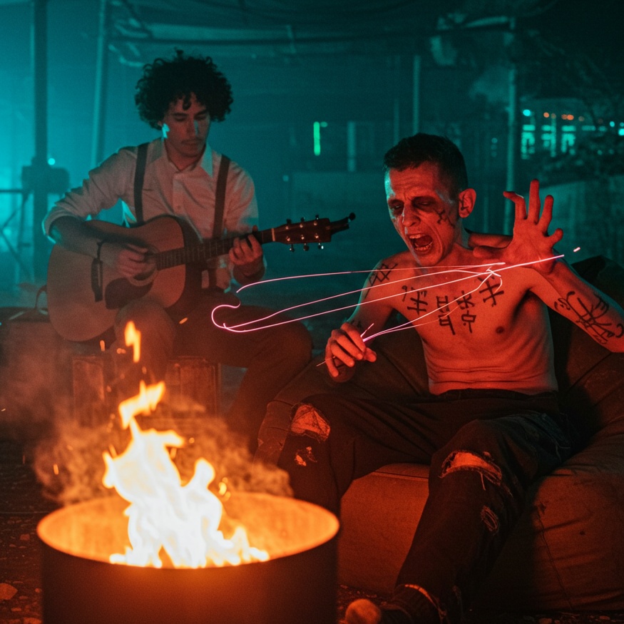 [Music Style: A dynamic, danceable, and genre-bending duet, Fuses gritty Spanish-guitar-driven Blues-Rock-Indie-Funk (BALTASAR) with high-energy Pop-Hip-Hop-Electronic and beatboxing (XION), Features a final, explosive toy saxophone funk solo, The backdrop includes subtle, unsettling toy accordion and xylophone melodies, ]