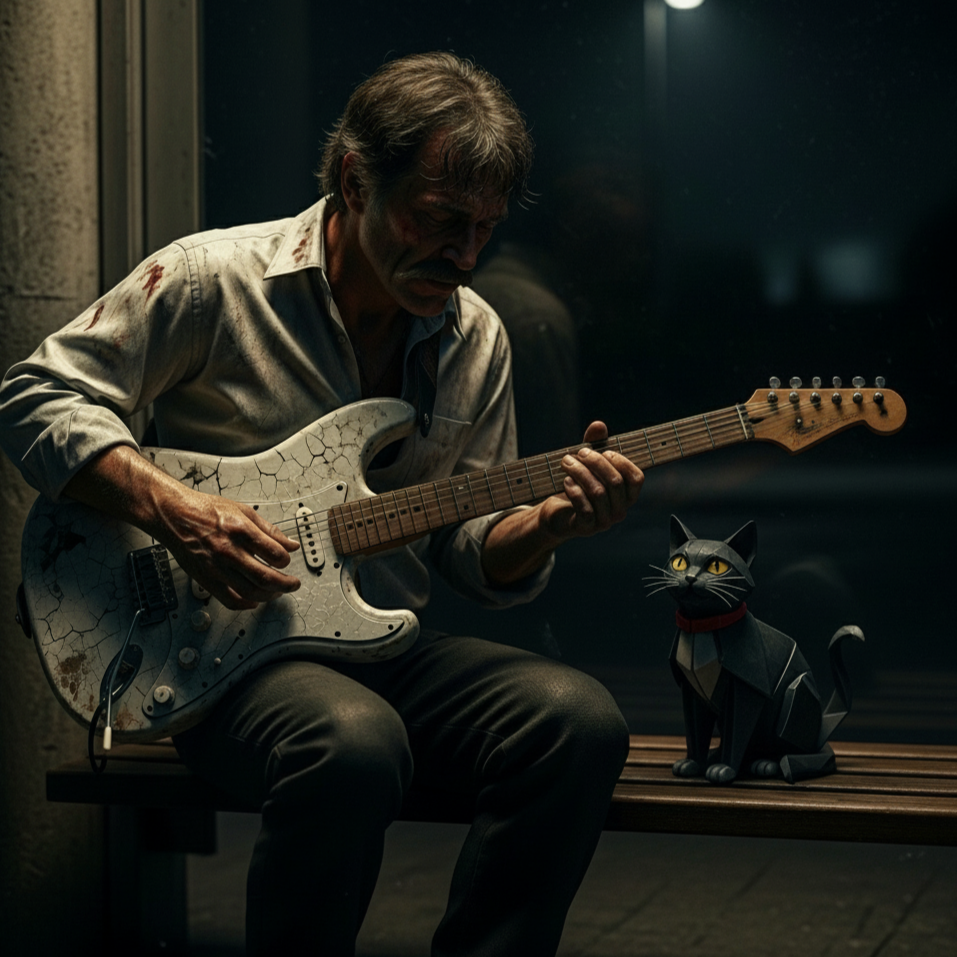 [Style: Rioplatense Blues-Rock with Lo-Fi Hip-Hop verses and huge, emotional, Atmospheric Rock choruses, Dynamic shifts are extreme, Lead Male Vox: Raspy, philosophical, drunken street-poet delivery, ranging from intimate whispers to raw, desperate cries, Backing Female Vox: Ethereal, percussive, tribal-style chanting in a high-pitched, childlike register, Weeping, soulful harmonica with beatbox accents, Melancholic Tango Bandoneón, Virtuosic, groovy, and melodic slap-funk bass, Drums shift from heavy Lo-Fi beats to driving, complex industrial rock, Sweet, tragic, and sinister, ~95 BPM (verses) / ~140 BPM (choruses), ]