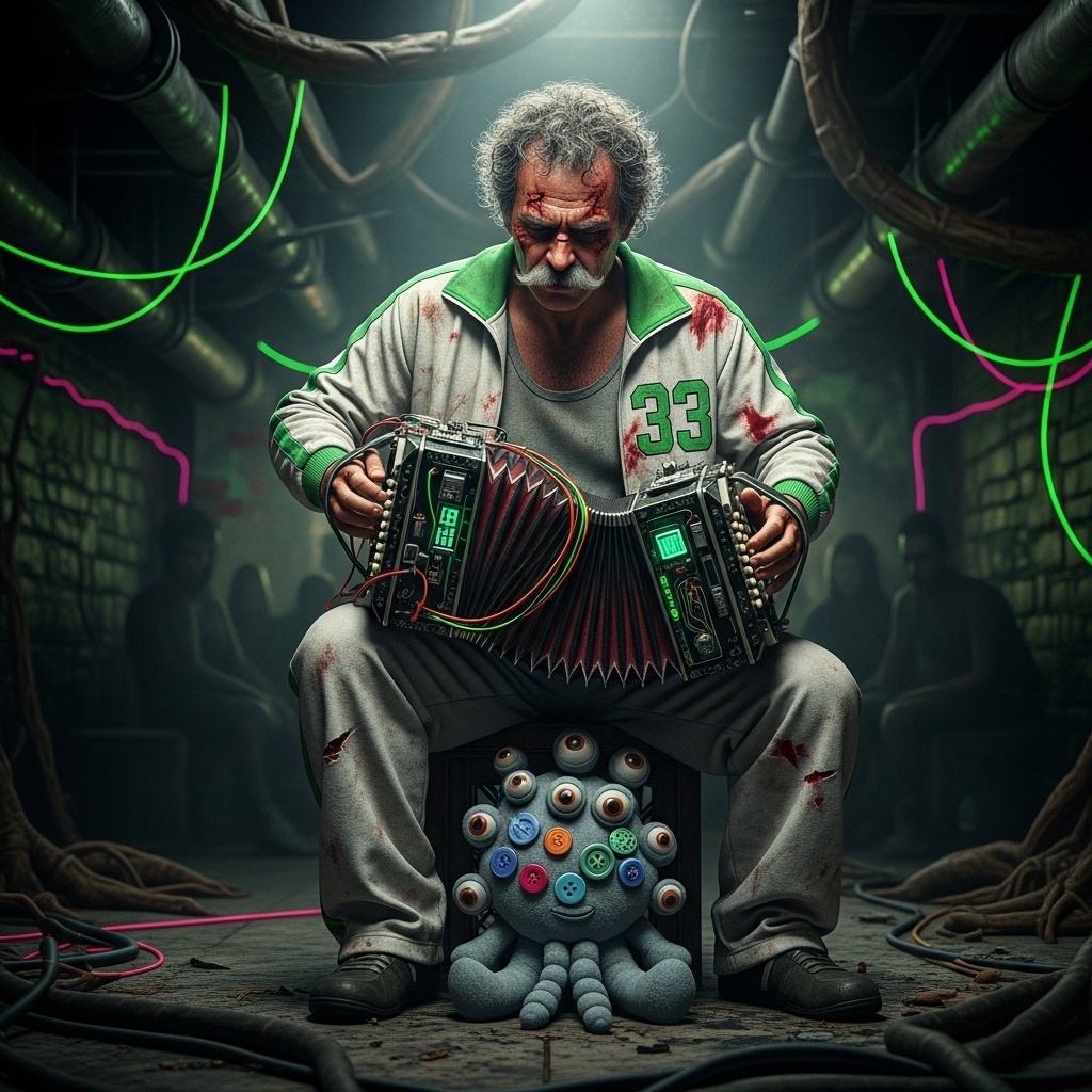 [Music Style: An epic, anthemic Alternative Rock/Grunge track with strong Tango-Blues, Industrial Funk, and Rioplatense stadium rock influences, Lead MALE VOX (Baltasar: raw, powerful, a blend of prophetic grunge shaman and cynical tango singer), Features a god-like lead GUITAR (Lyre-3000: bluesy, psychedelic, and capable of soaring metal riffs), a demonic, funky, and driving ACCORDION/BANDONEÓN BASS (The Accordionist), and a massive orchestral/brass sound created by summoned "Archon" musicians, all over a powerful, tribal-industrial EDR-esque drum beat, The song is simple in structure but immense in sound and emotion, designed for massive singalongs and deep introspection, ]