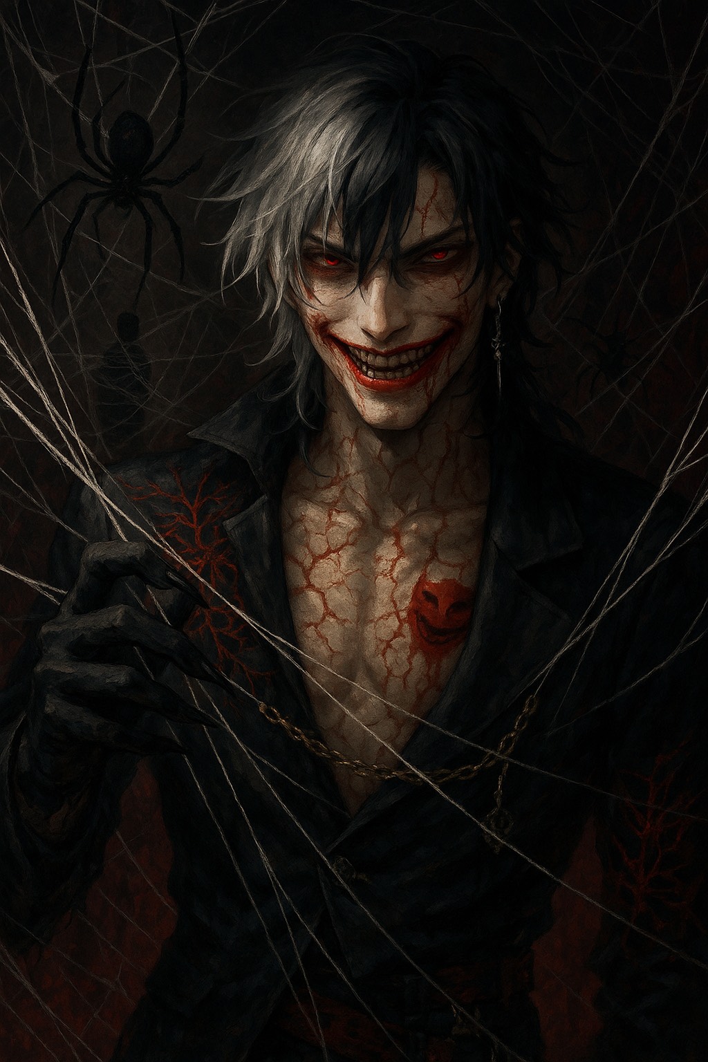 Dark electronic rock / very baritone voice, low and silky but with a toxic rasp, calm and controlled, sounds like a smiling sadist, subtle laughs between phrases, male vocal, Japanese accent, mid-low range, smooth but slightly raspy tone, cold and seductive, playful yet menacing, occasional breathy chuckle, controlled and articulate like a charismatic villain, punk song, midâfast tempo (140 BPM), distorted electric guitars, heavy synth bass, glitchy electronic beats, male vocal, slightly low and seductive but unhinged, laughing tone, Joker-like chaotic vibe, lots of reverb and saturation, dramatic build into powerful choruses, lyrics in Japanese with some English words like âlaughâ, âglitchâ, âcrazyâ, overall mood is dark, playful, poisonous and stylish