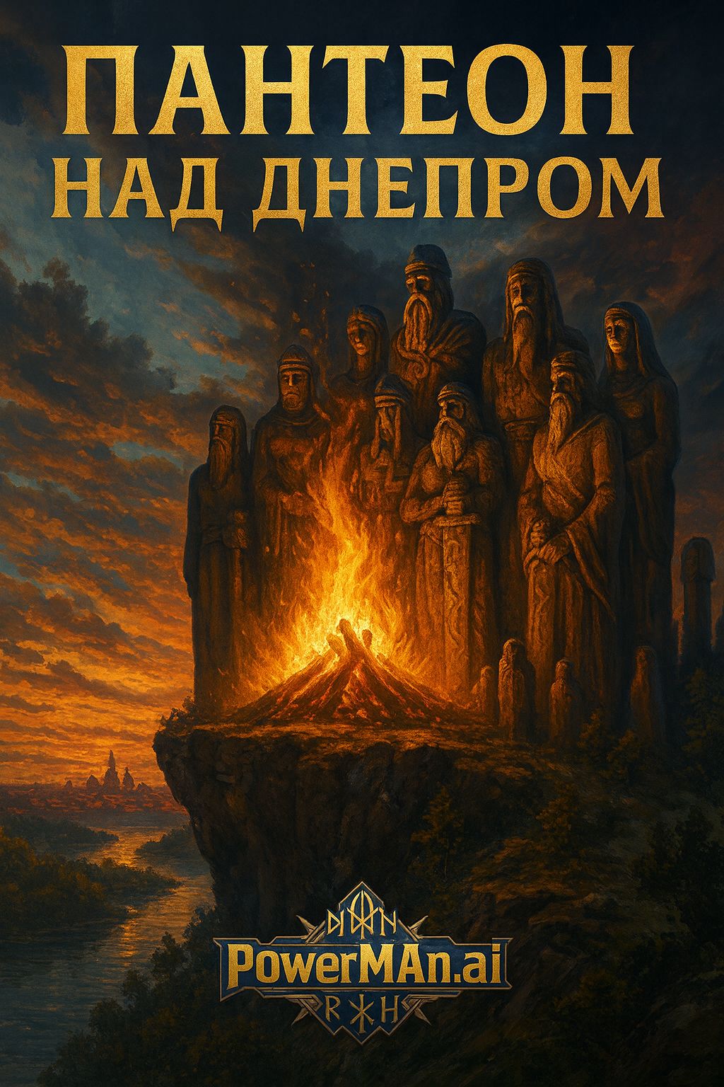 Slavic Ethnic Symphonic Rock Lyrical Ballad about the rise of the Slavic Pantheon in Kyiv in 980 AD, Deep male and female vocals with ancient energy and emotional power, Theme: the glory of pagan Rus’, the gods Perun, Dazhbog, Lada, Mokosh, Veles, Stribog, and Khors — eternal fire and faith of the ancestors