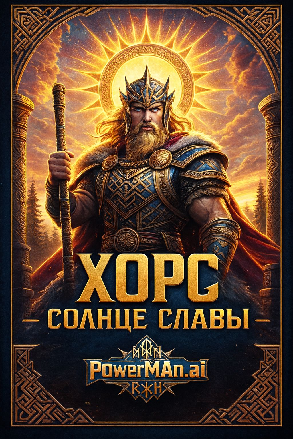 Slavic Ethno Symphonic Metal song about the East Slavic Sun God Khors, Multi-voice arrangement (male & female choirs), epic orchestral metal style with Slavic ethnic instruments (gusli, flute, tambourine, violin, war drums), Mix of Slavic languages (Russian, Ukrainian, Belarusian, Polish, Serbian, Bulgarian, Czech, Slovak), Dynamic transitions from soft ethereal female chants to powerful metal chorus, Theme: rising sun, divine light, rebirth, and eternal flame of Khors, Title: “ХОРС — Солнце Славы”