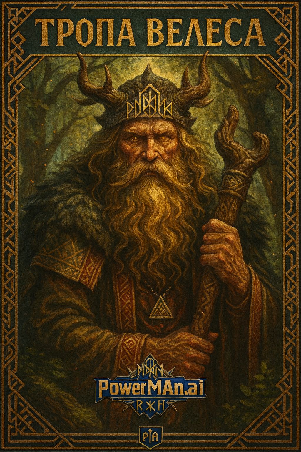 Slavic Neofolk song about the god Veles — ancient Slavic deity of wisdom, wealth, animals, and the underworld, Deep male vocal, mystical atmosphere, forest ambience, ritual drums, wooden flute, vargan, and gusli, Slow, earthy rhythm, cinematic folk mood, Language: Russian