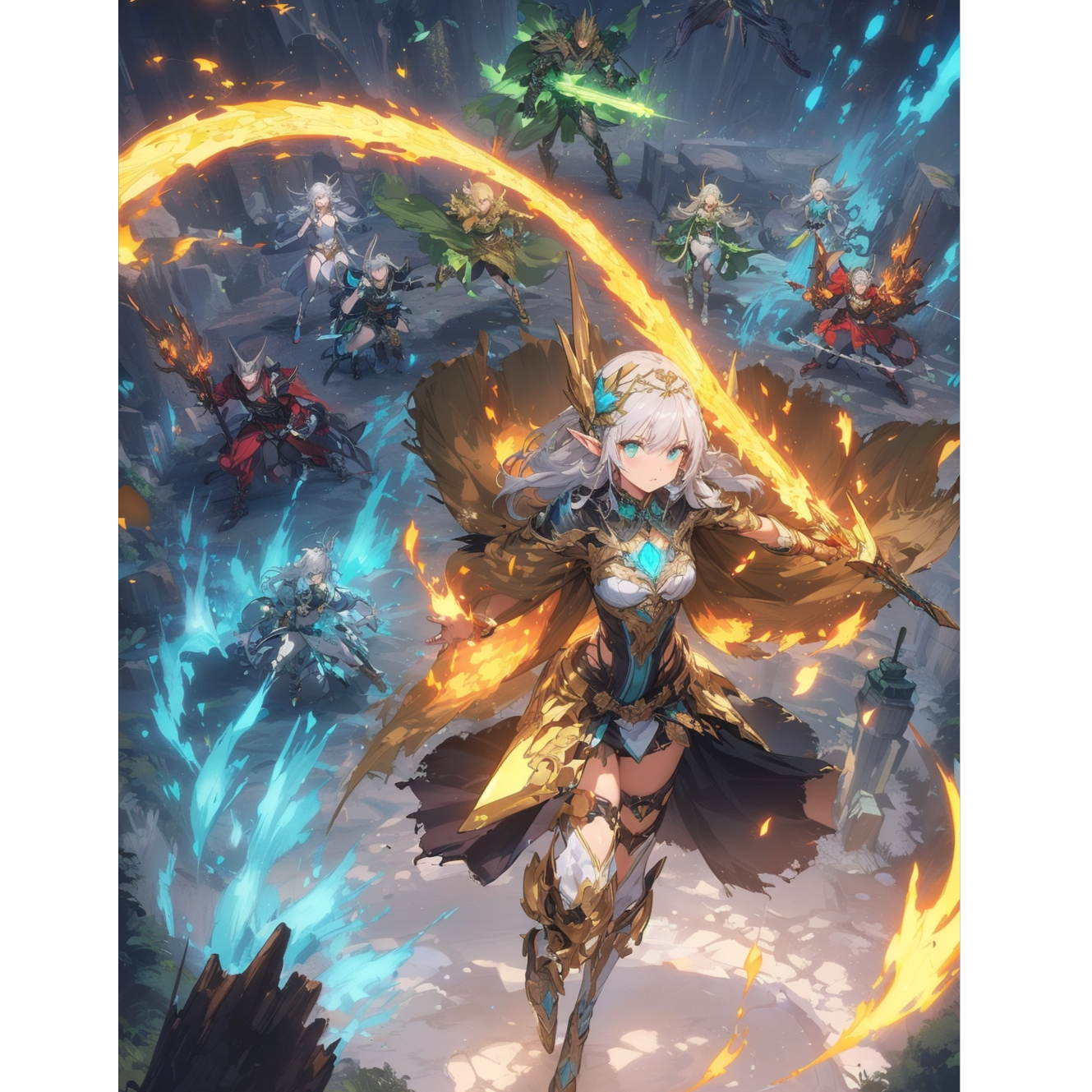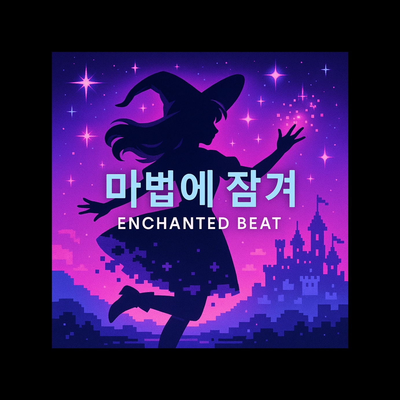 Begins like a polished, modern K-pop track — clean synth pads, bright vocal harmonies, clap-based rhythm, As the song progresses, it morphs into a Chiptune/EDM/TRAP hybrid: pixelated melodies, glitch FX, aggressive bass, and 808 hats, Thematically fantasy-driven — lyrics describe a magical realm, ancient spells, and mystical transformation, tied to a metaphor of dance and rhythm