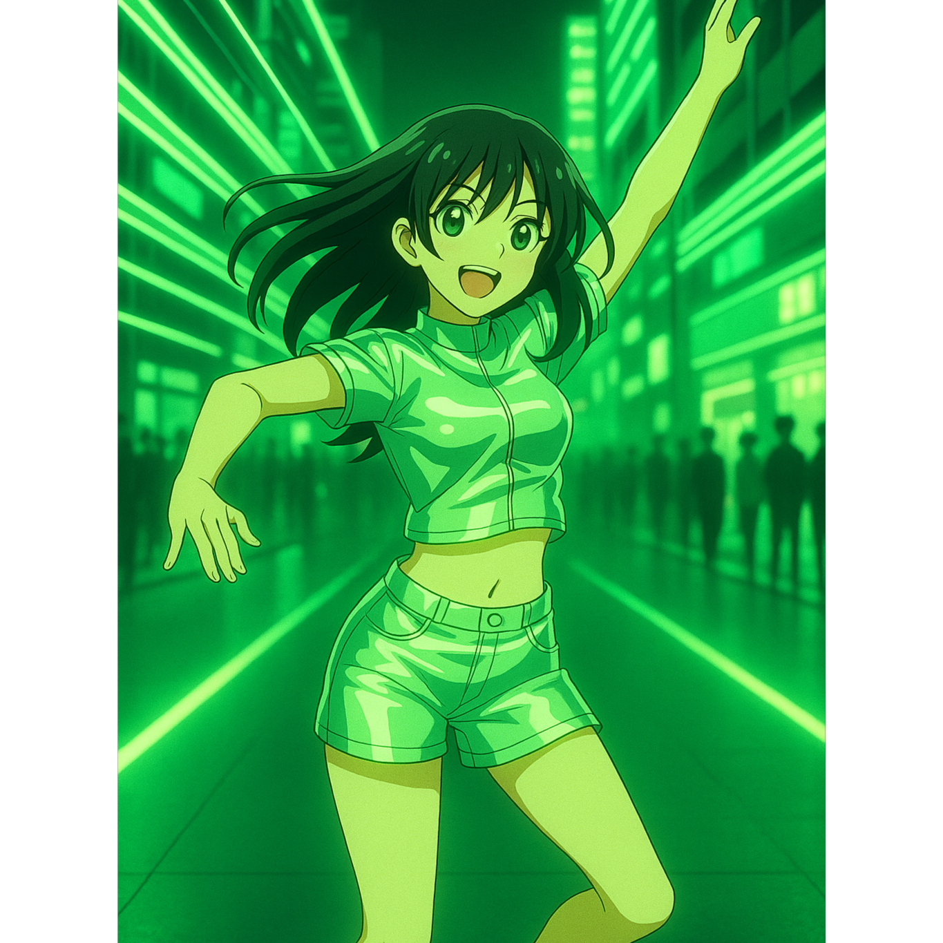 Create a high-energy, rhythm-driven dance track that fuses electronic pop with hip-hop elements, The song should feature an intense, pulsing beat with heavy electronic synths, glitchy effects, bold basslines, and layered percussion, Incorporate a mix of sung and rapped vocals with sharp rhythmic flow, The structure should be experimental and unpredictable—drop sections, whispered intros, sudden tempo shifts, and dance breaks are all welcome, The lyrics are in Japanese (written entirely in hiragana), but include short English phrases like “don’t stop, ” “just feel, ” and “go insane” for added edge, The theme is about letting go of thoughts and letting dance fully take over the mind and body, The tone is chaotic, fun, wild, and totally hypnotic—designed to make listeners lose themselves on the dance floor, Think of a fusion between club-ready EDM, quirky hyperpop, and attitude-packed rap, The female vocal should have range—sometimes playful, sometimes intense, with bursts of whispered and