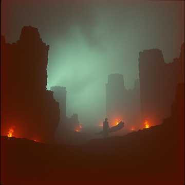 psy-dub track with deep, heavy basslines, 144 BPM groove, hypnotic rhythm, and atmospheric echoes, Vocal alternates between a commanding voice (strong, defiant, mystical) and a deep tone (warrior-like, reflective, gritty), Minimalist percussion, spacious reverb, classic dub delays (1/4 and dotted 1/8 notes), creating a hypnotic atmosphere, Lyrics evoke ancient conflict between war and peace, trading pride for love, with poetic symbolism of fire, ashes, and silence, Emotional mood: intense, meditative, rebellious