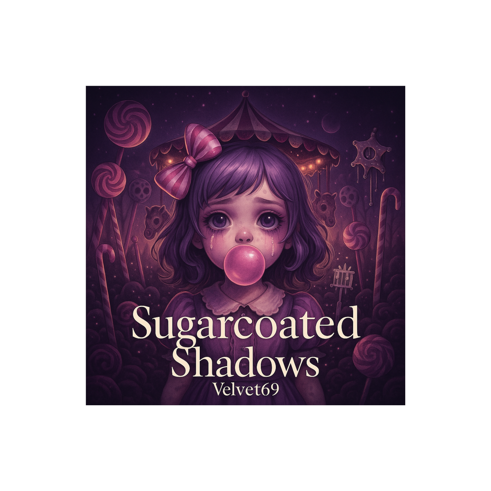 dark bubblegum pop, playful, and echoing claps, cinematic and glittery, fragile female vocals, nursery, distorted bass, bouncy pop beat with toybox synths, high and breathy, glockenspiel, with a cracked, breathy, bubblegum pop, female vocals, tone, haunted edge, dramatic, pop, eerie yet playful