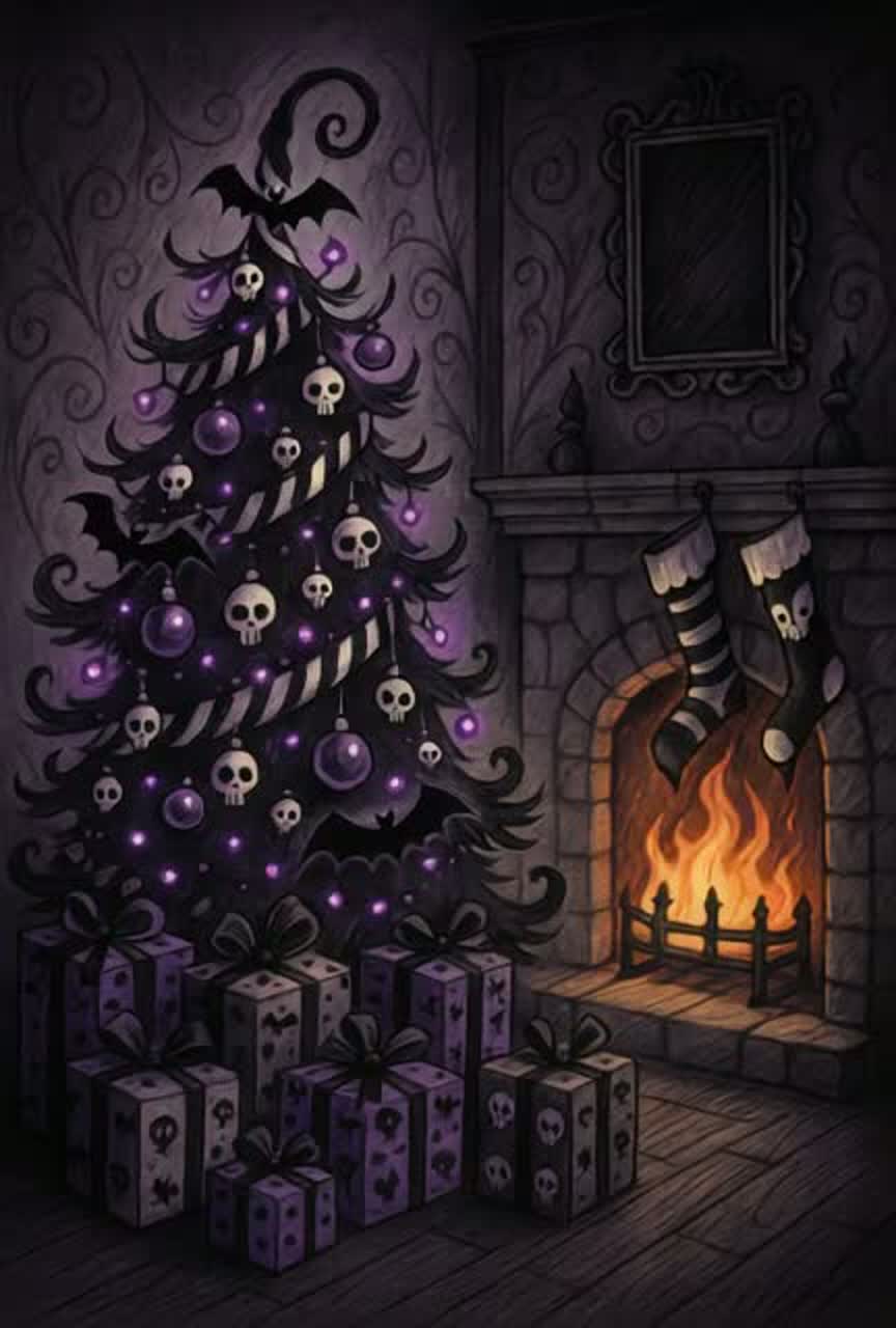 Spooky Christmas fusion (think pop-punk meets holiday cheer, playful campy vibes, bouncy rhythm, sleigh bells mixed with eerie organ riffs, guitar + synth)