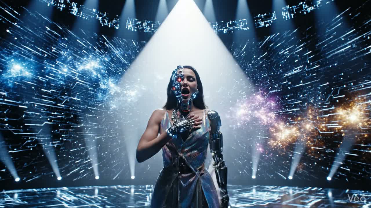 Style: Ethereal ambient-techno, A beautiful, lush, clean, digital synth pad, Soaring, high-frequency, bell-like melodies, A gentle, minimalist, 4/4 kick drum, A serene, female, robotic-vocal [vocoder] sings a wordless aria, The sound of a perfect, clean, technologically-managed paradise