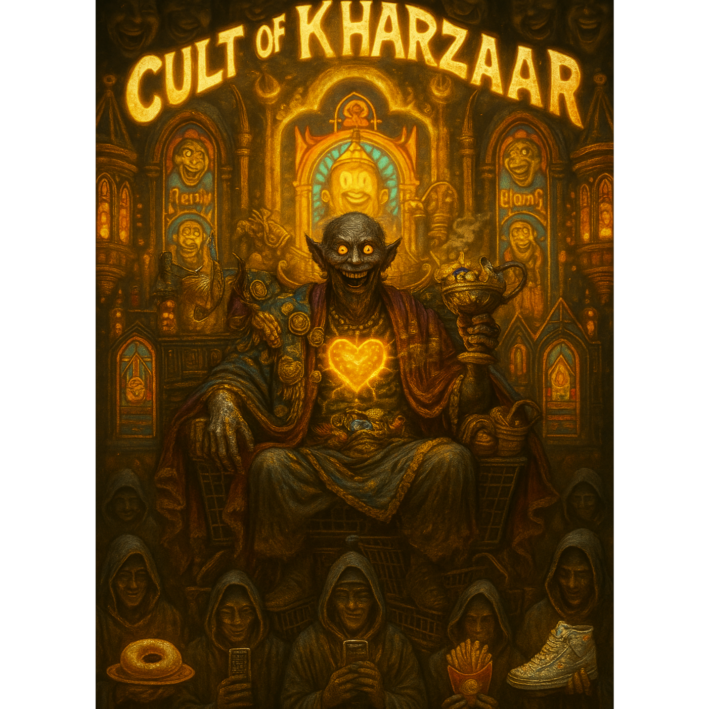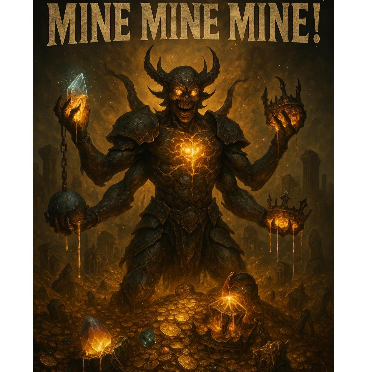 Frenzied Greedcore Rap erupts with cataclysmic 808s and thunderous war drums driving a breakneck trap beat, Distorted choral chants and organ stabs add drama, while metallic clangs and deep brass layer monstrous heft, Demonic whispers coil through sections, heightening the triumphant, sinister giddiness
