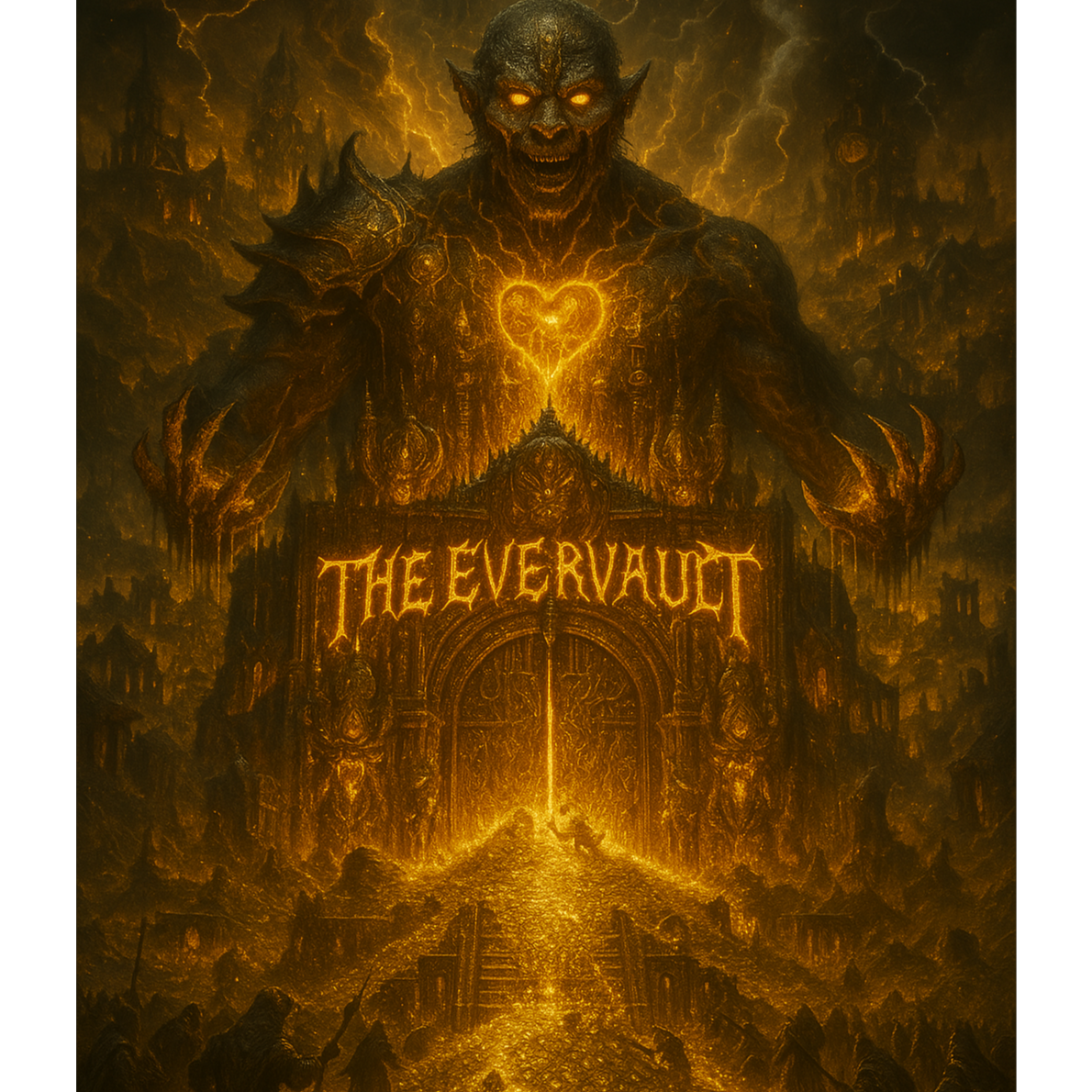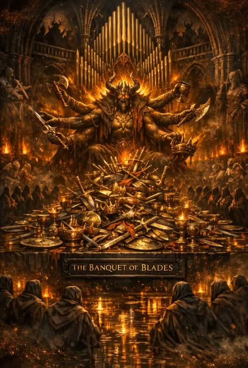 This track fuses orchestral trap and doom metal, led by a grand pipe organ ringing through cavernous space, Distorted guitars grind with monstrous riffs alongside rumbling 808s and thundering war drums, A demonic choir mocks over sharp lyra runs, while arpa adds nightmarish flourishes, The sonic texture is dense, fierce, and relentlessly intense, ultimately building to a final, victorious crescendo