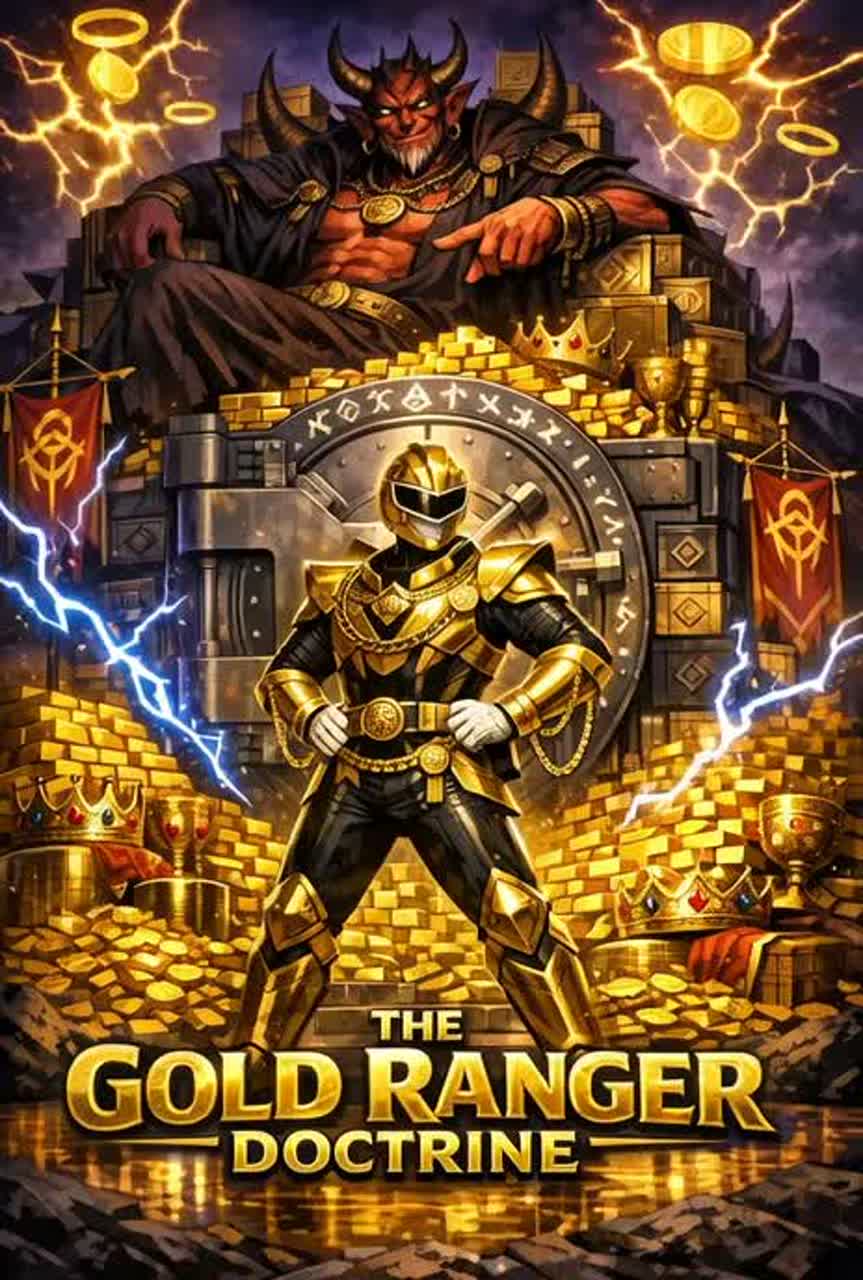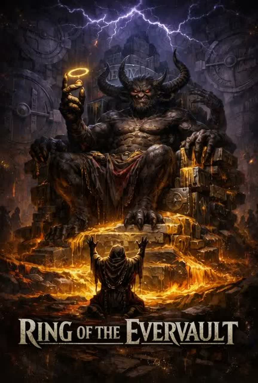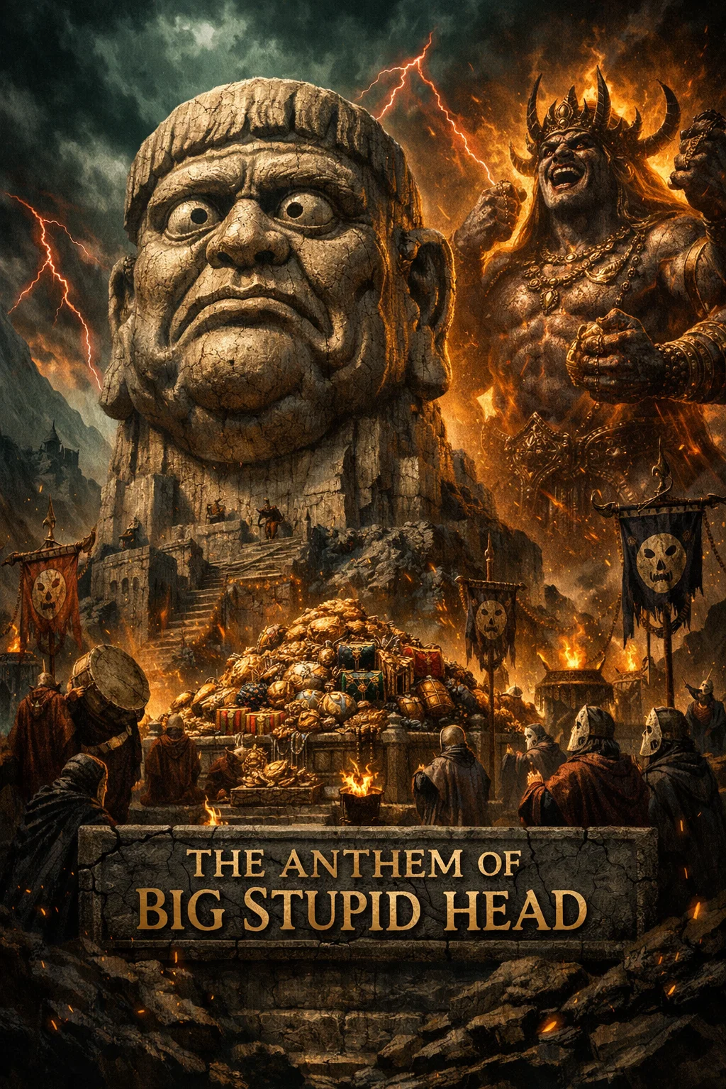 Starts with thunder FX, stadium reverb and coin clinks over galloping rhythm guitars and bright, heroic harmonic leads—all in a bombastic nu-metal/greed metal/doom fusion, Punchy double-kick and booming toms drive dramatic, “Saturday-morning” energy, Verses boast commanding vocals: clean, powerful projections with smug narration, touched with growled laugh asides, Choruses detonate with chant-along gang vocals, stabbing key changes, and mock-heroic progression—hero stings and triumphant hits land on gleefully immoral moments, Over-the-top arena mix, glossy highs, and rhythmic sound FX amplify the comedic, villainous swagger