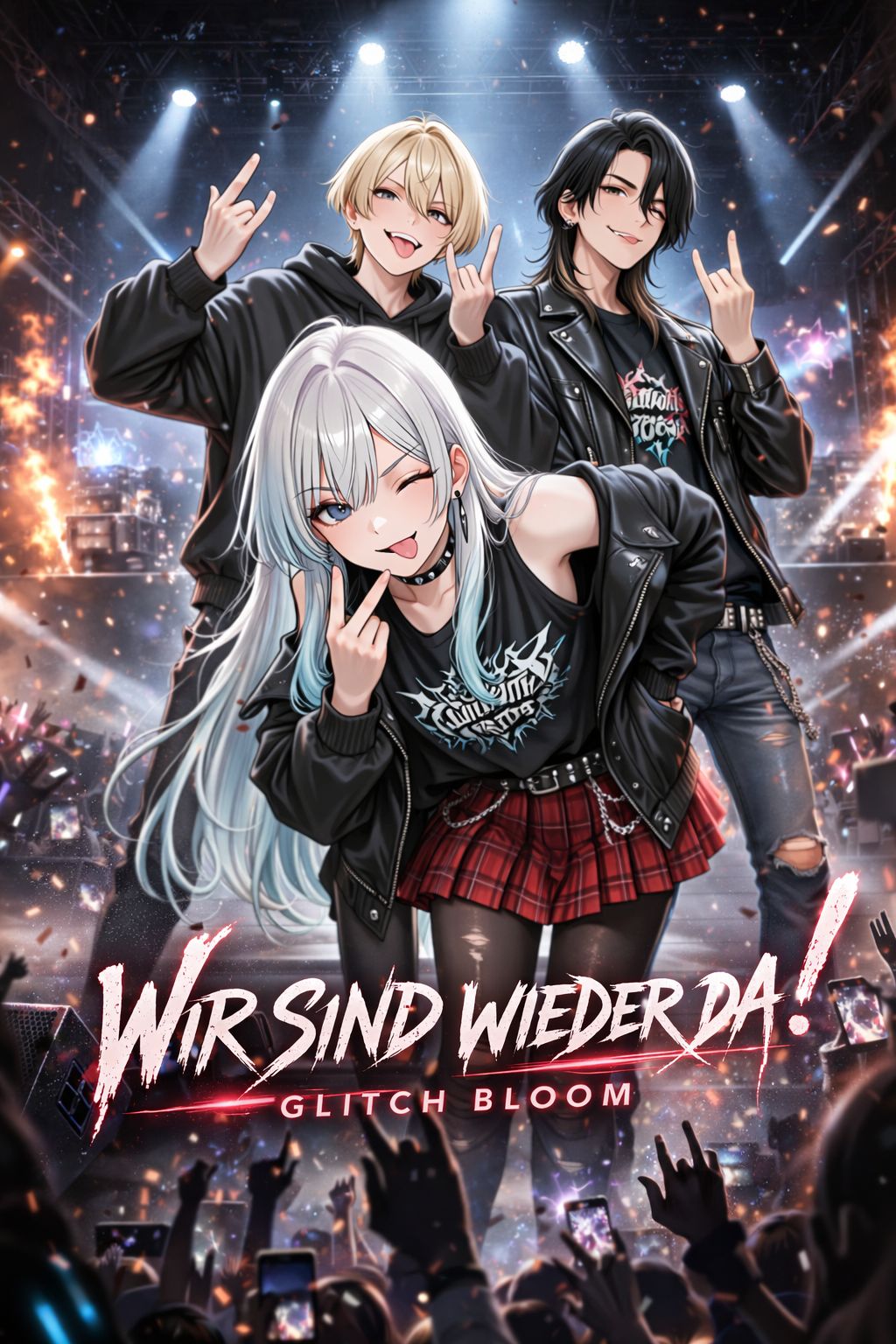 Genre: Energetic live performance of Rock, Trap, EDM, Punk, soft violin, Mood: Warped Tour vibe, slightly aggressive, stirring rhythm, power chords, cheering audience, live concert atmosphere, screaming background vocals, Lead voice: german vocals, solo, high female vocals, gritty texture, raw texture, clear pronunciation, Back voice: german vocals, male vocals, very gentle, delicate, head voice, androgynous pretty boy, youthful, fragile sound, emotionally tender