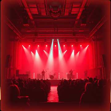 Industrial Symphony with apocalyptic choirs, heavy metal guitars, and cinematic drums in a raw live performance, Harsh German vocals shouted through a loud stage mic, slight feedback, open room reverb, and imperfect edges, Distorted analog synths rumbling through venue speakers, mechanical rhythms shaking the hall, Audience noise, cheering, clapping, and reacting to every drop, creating a loud, immersive concert atmosphere with real stage energy and crowd presence