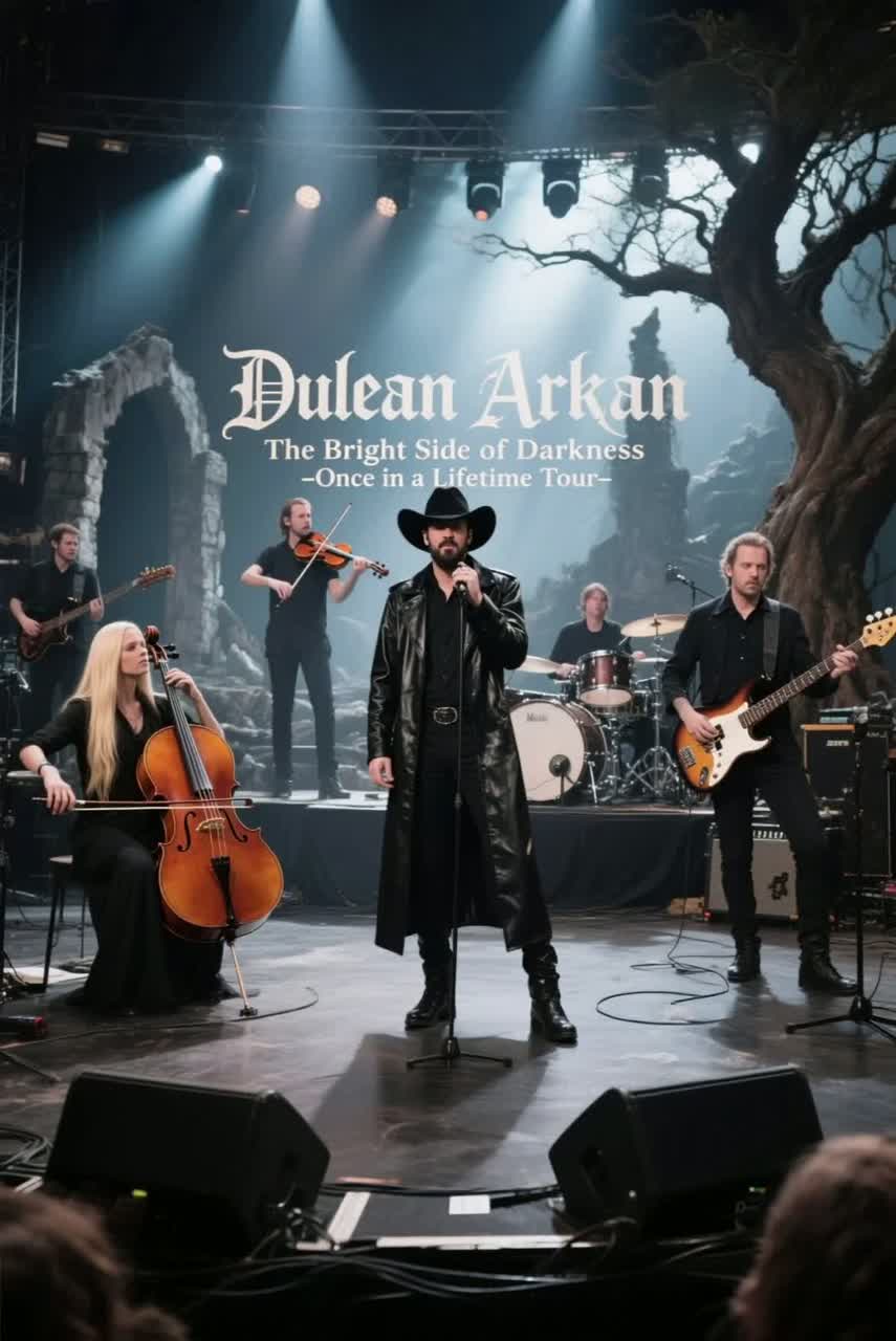 Dark, theatrical Neo-Classical Live Open Air performance with gothic and cinematic atmosphere, Deep male baritone vocals with live symphonic orchestra (strings, piano, harp, brass, timpani), Slow hypnotic tempo with melancholic and immersive tone, Recorded outdoors under the night sky, Crowd audible during key moments as **singing/mitsinging**, independent from vocals, Intro includes long stage announcement + applause, Crowd reacts naturally to emotional verses and crescendos during orchestral peaks, fades naturally in outro, Notes: ensure intro is never skipped, maintain stereo realism, balance crowd volume to preserve intimacy, open-air reverb, subtle wind texture, ‑humming, ‑pop, ‑rock, ‑EDM, ‑band names, ‑rap, ‑heavy percussion, ‑electric guitars