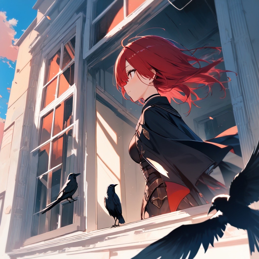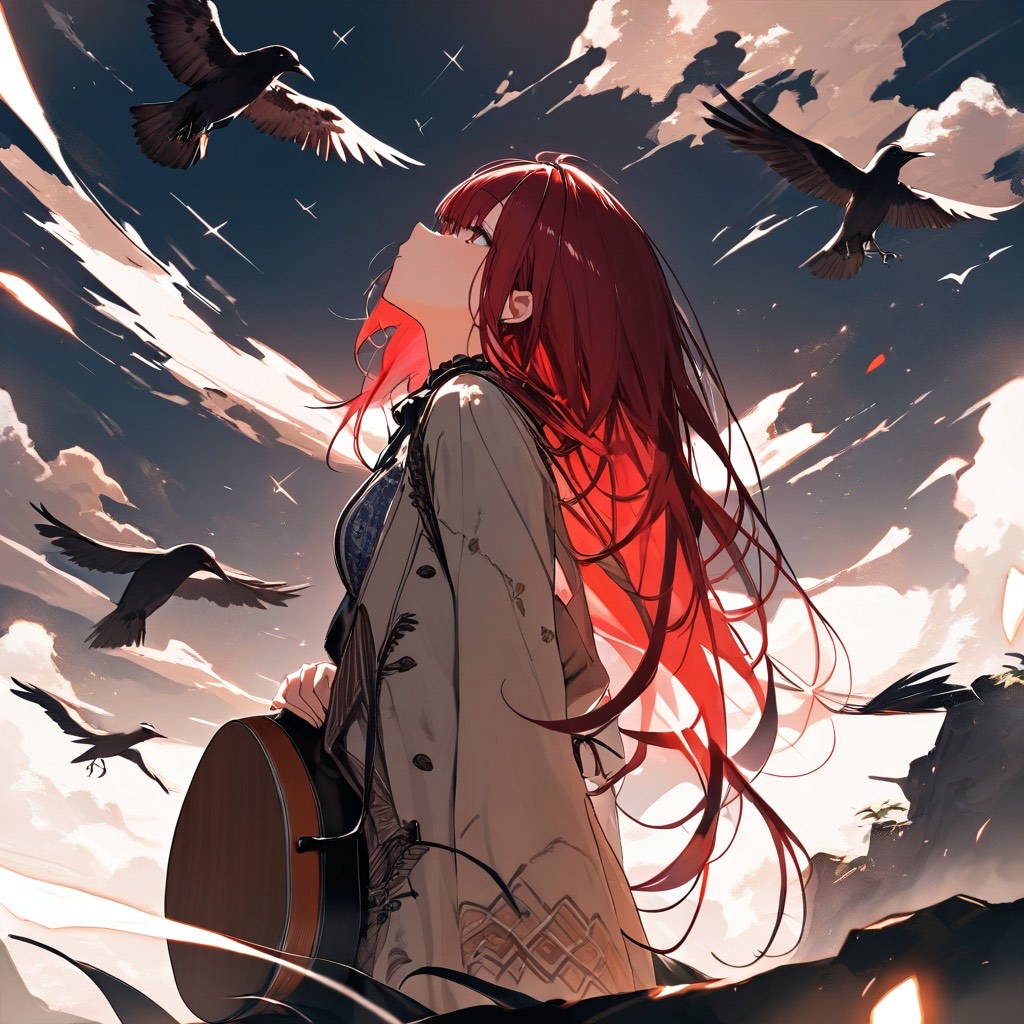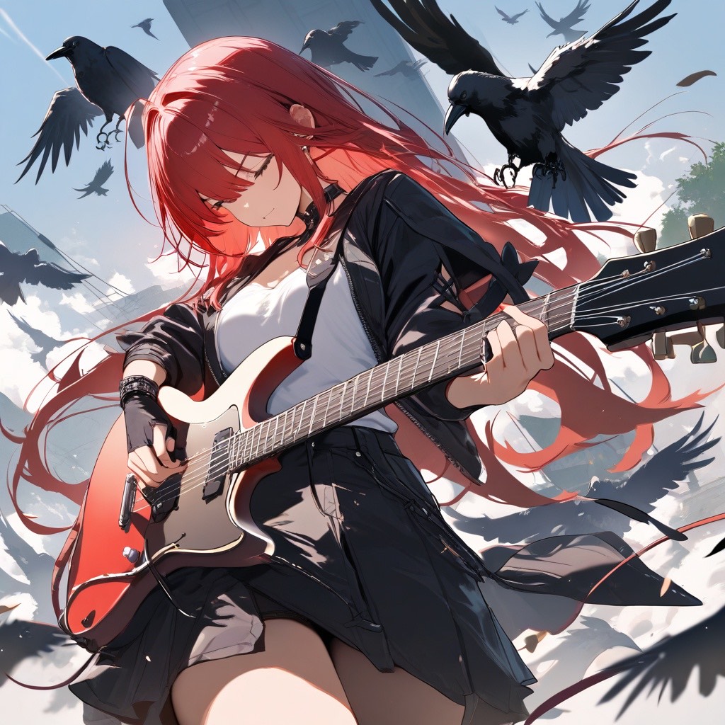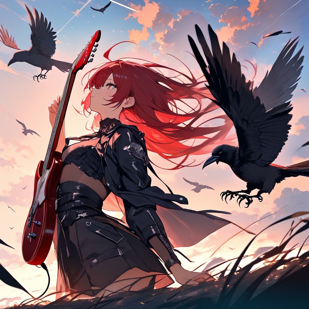 Emotional Japanese-English bilingual rock ballad sung by a female vocalist, Slow tempo (around 75 BPM), with a melancholic yet hopeful atmosphere, The song begins with soft ambient piano and acoustic guitar, gradually building with cinematic strings, deep bass, and subtle drums, The vocal is warm, expressive, and fragile — gentle and whispery in the verses, powerful and soaring in the chorus, The lyrics express unspoken gratitude, silent companionship, the pain of illness, and a final farewell to a black crow who always flew quietly by her side, Style inspired by Japanese anime ending themes, emotional J-Rock ballads, and modern Japanese female vocalists, Use heartfelt melodies, soft ambient textures, and a dynamic build-up from intimate to grand, Include Japanese lyrics about love, memory, loss, and saying goodbye to a beloved crow spirit, Feature dual acoustic guitars panned left and right for a wide stereo sound, One guitar should be brigh, “Soft start, heavy guitars, fade out, ”