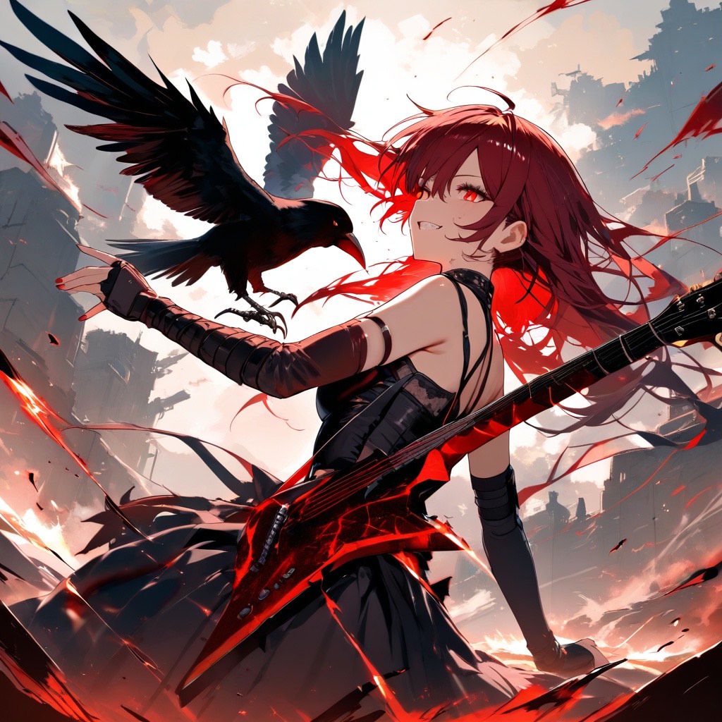 Ravens Rock, [Style]: Futuristic Emotional J-Rock, Female Japanese Vocals, Twin 7-string guitars drive a metallic yet transparent J-Rock tone, Dual-track setup: clean + chorus vs light-drive, hard-panned L/R, precise 16th-note pulse, 1/8 dotted delay adds spatial depth without masking fundamentals, Rhythm features tight palm-muted low-string riffs (D-modal), mechanical alternate picking, and clean/overdrive hybrid for sharp attack; dynamic strums with controlled transients, Arpeggios use subtle chorus, sync’ed delay tails for futuristic shimmer, occasional reverse ghost notes for propulsion, Leads employ micro-bends, wide vibrato, position shifts; subtle wah and light saturation shape sustain, Tone balances metallic mids (2, 5–4 kHz), tightened low-end, minimal modulation depth, and rhythm/lead clarity at 185 bpm