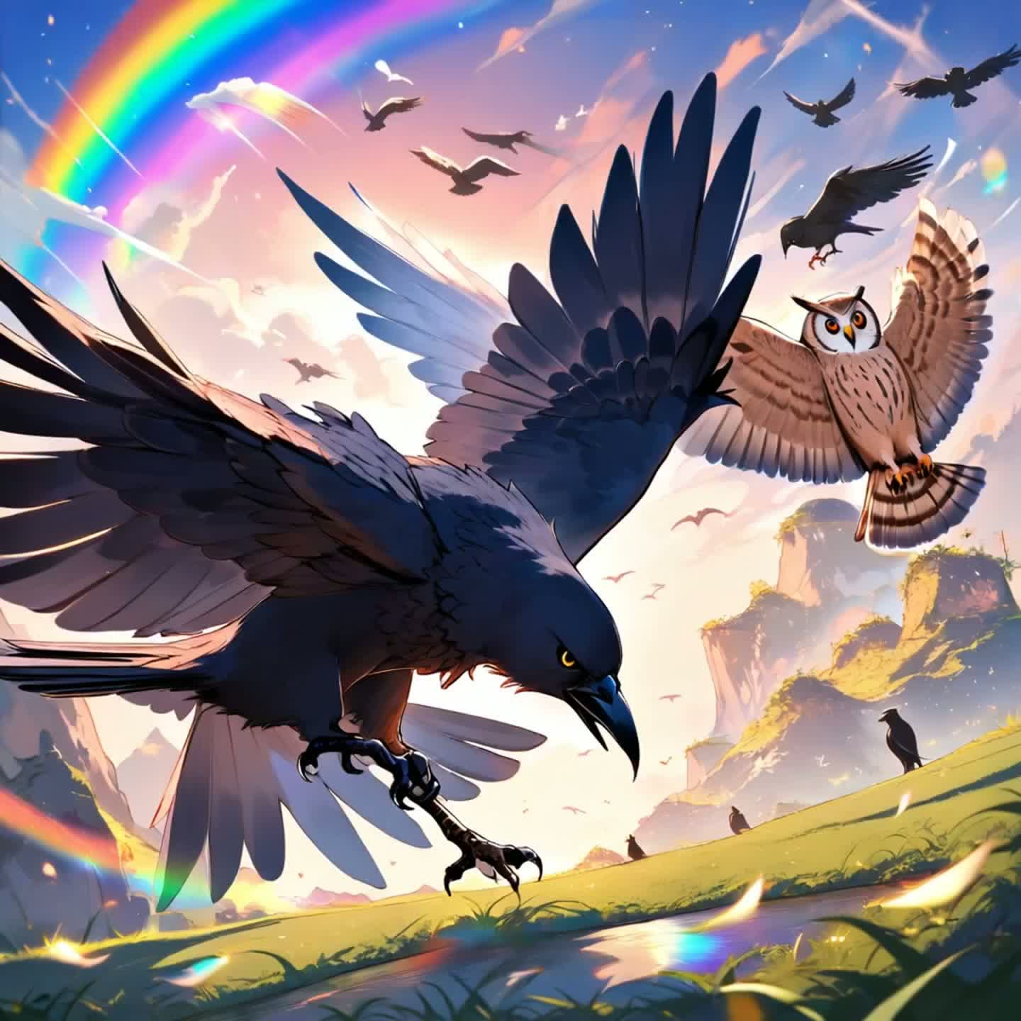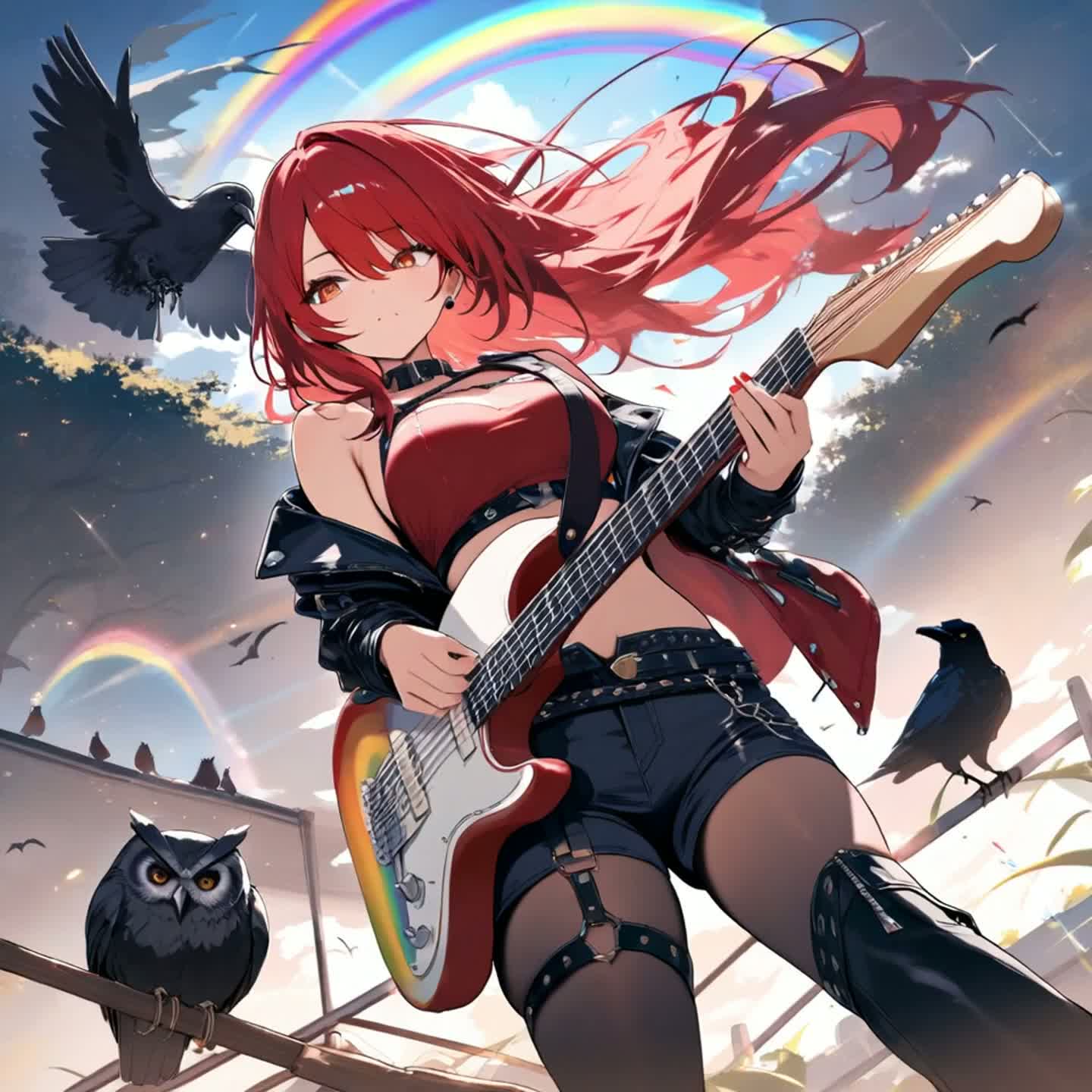 Female Vocal Fixed, Japanese, V-Rock, Bpm90, key:, E♭ minor, A cinematic Japanese alternative rock song in the style of featuring emotional vocals, melodic guitar solos, and a blend of darkness and light, The lyrics reference owls, rain, and a rainbow that symbolizes hope after a long night, Starts with a clean guitar intro and ends with a soaring chorus and ambient guitar outro, Emotional femare vocals in with a soft whispering tone in verses and powerful falsetto in the chorus, Melodic phrasing with a dramatic delivery, Clean electric guitar with echoing arpeggios in the intro and verses, Gradual build into distorted rhythm guitars and a melodic lead guitar line in the chorus, Includes a dramatic guitar solo with vibrato and bending, reminiscent of 98s J-Rock ballads, Ambient synth pads and subtle piano layers to add emotional depth, especially in the bridge, Soft reverb and atmospheric textures that blend with the guitars and vocals, Soft, minimal percussion in the intro and verses usin