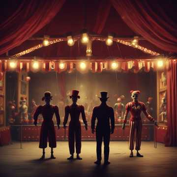 dark carnival brooding orchestra male voice inviting the world to madness high energy theatrical street performance vaudeville oration