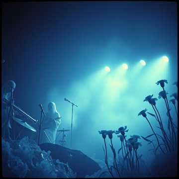 spooky goth organ, glam rock, theatrical with pounding rhythm and eerie melodies, layered male vocals and dramatic dynamic shifts, rock