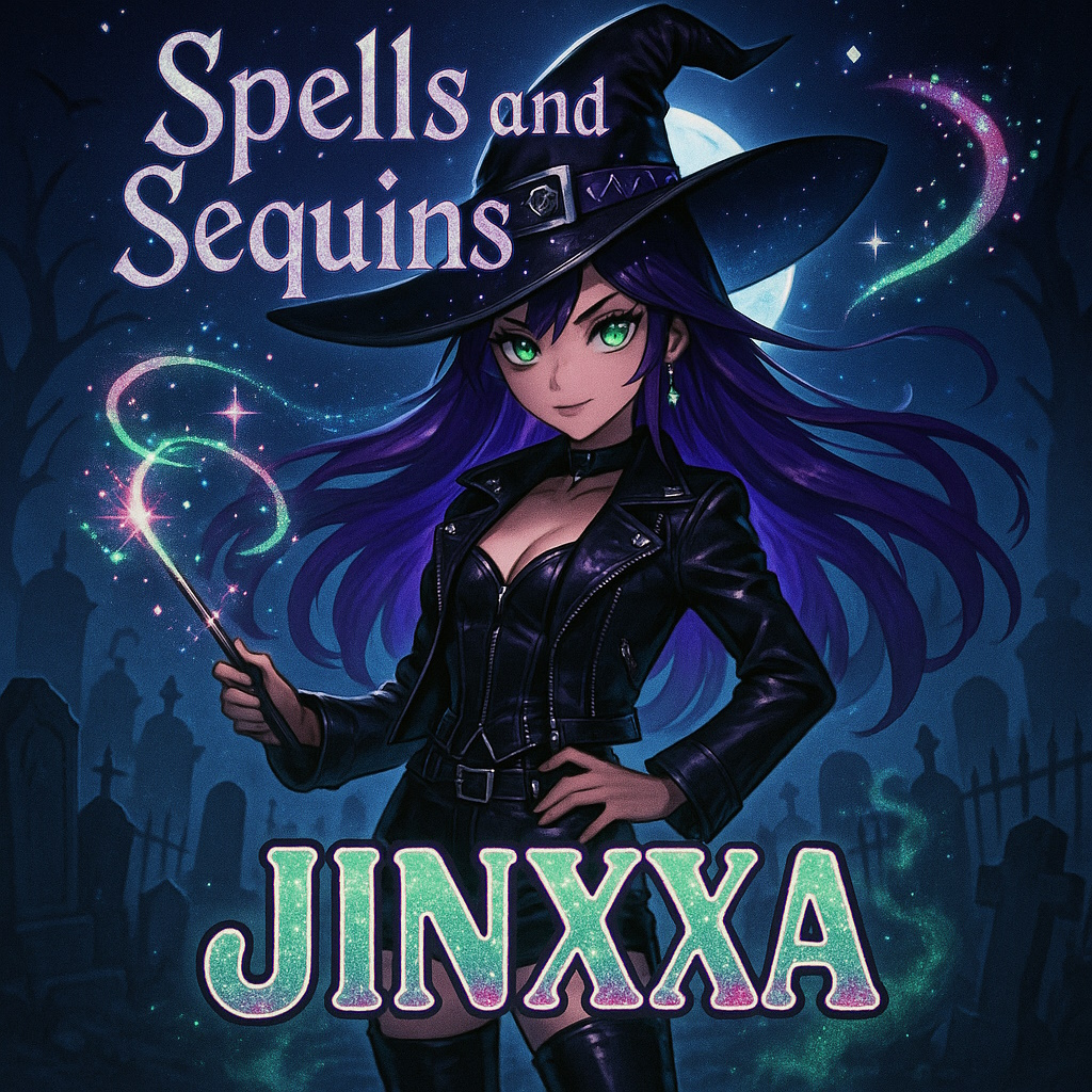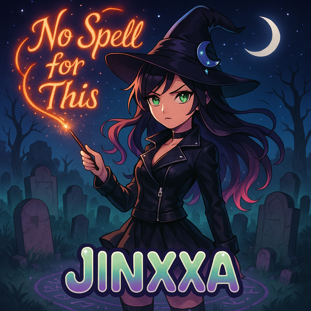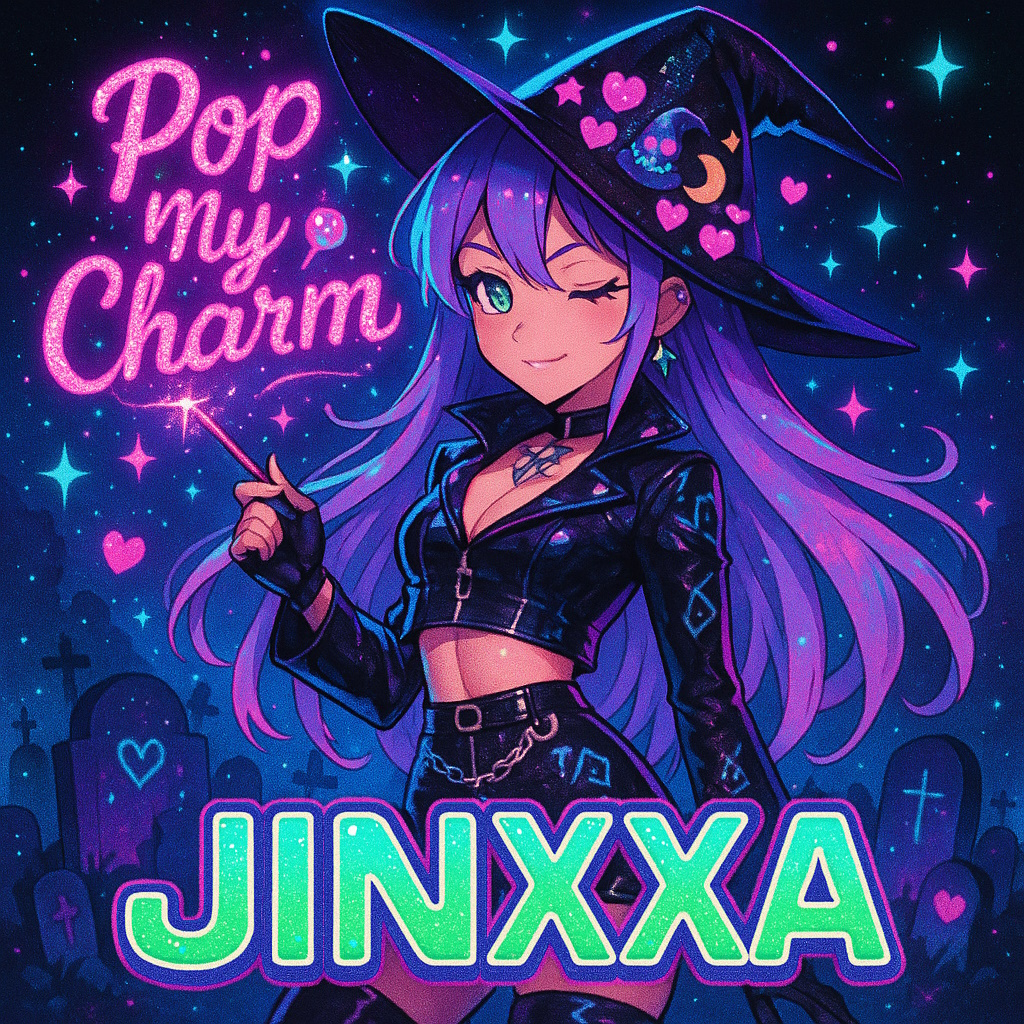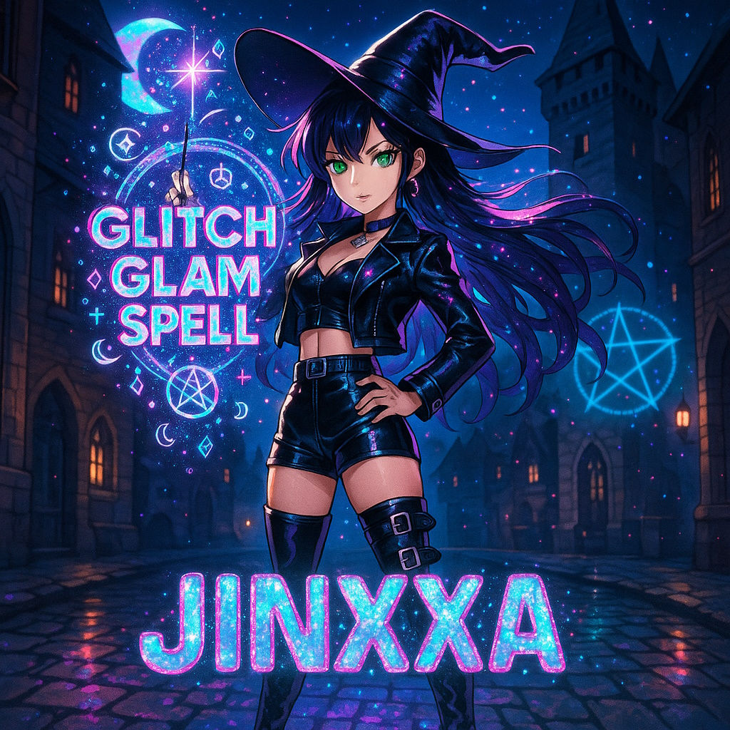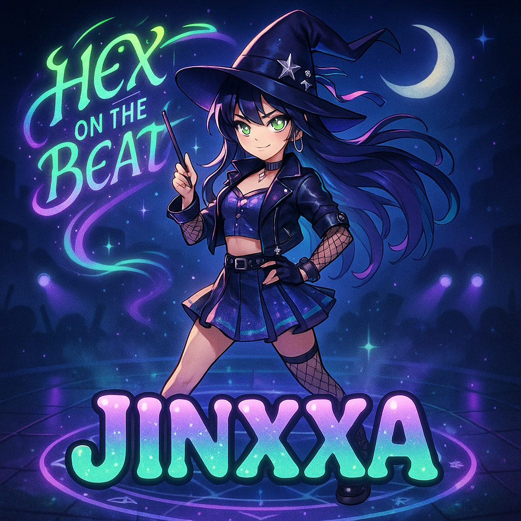 K-pop dance track with a mystical, futuristic vibe, Female anime teen vocals — high-energy, playful, and hypnotic, Instrumental features punchy electronic beats, glitchy synth layers, and a pulsing bassline with cyber-spell flair, Include magical sound effects like digital sparkles, glitch distortions, and echoing whispers, The pre-chorus and bridge should be structured as eerie chant sections repeating the word “Jinxxa” with layered vocal effects, Build tension in the bridge with a ritualistic rhythm and explode into a high-energy final chorus, Overall tone: mysterious, empowering, and enchanting — like casting a digital spell through dance