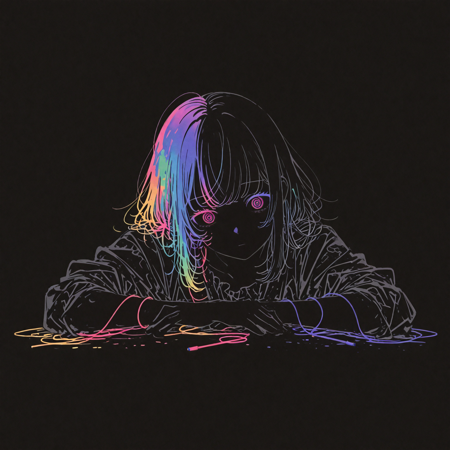 Vocal Character: Kasane Teto–like timbre (playful, bright, a little nasal), fast-tempo Vocaloid song, night city atmosphere, neon lights, emotional and melancholic mood, repeating catchy hook, electronic + rock fusion, distorted guitar riffs, sharp drum beats, synth arpeggios, strong bass, glitch effects, echo vocals, addictive loop feeling, floating night feeling, dreamy ambience, reverb space, airy synth pads, husky voice, electro rock, neo alternative, minimal techno groove, deep bassline, syncopated rhythm, layered synths, atmospheric pads, sharp guitar riffs, driving kick, emotional yet detached vocal, poetic and abstract lyrics, night city mood, introspective and modern, experimental sound design, space synthe, drum, chaotic and layered sound, heavy distorted synths with cutting drums, cinematic strings mixed with electronic noise, aggressive low bass, scattered processed vocals, dynamic intensity, emotional and epic atmosphere, piano pop, piano, ‑cutesy idol vibrato, ‑ballad tempo, ‑trap hats rolls, ‑overly dark dubstep growls, ‑long reverb tails muddying the kick, ‑acoustic drums, ‑live-room ambience, ‑orchestral strings