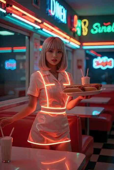 K-Pop girl group with hyperpop + Porter-inspired warmth, Playful rhythms, bouncy synths, euphoric drops, subtle glitch bursts, Video-game style synth arpeggios, side-chained bass, light sound design (cash register, sizzling pans, door chimes) blended musically, Unique female vocals with catchy ad-libs, whispered pre-chorus, glitchy accents in choruses, Balance of high-energy chaotic sections (rush hour) and emotional, mellow bridges (reflective everyday beauty), ‑No rock guitars, ‑no heavy dubstep growls, ‑No dark or aggressive tones, ‑No dense glitch chopping — glitches should be playful, ‑sparkly, ‑and musical, ‑Avoid overly complex lyrical storytelling — ke