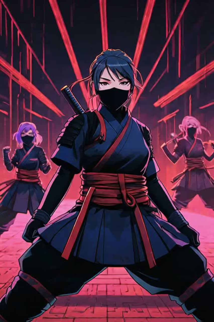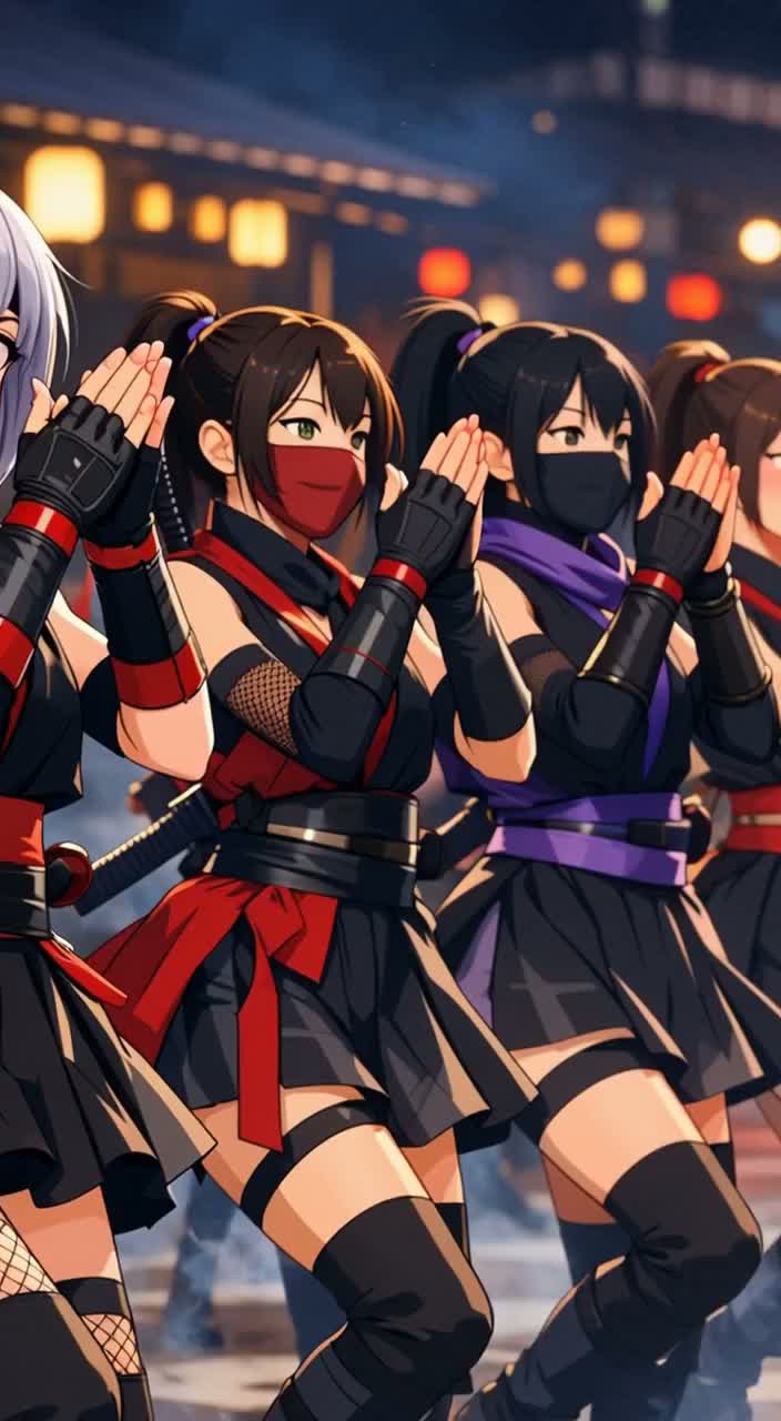 High-energy Japanese club dance track inspired by a kunoichi (female ninja) theme, Driving EDM / club beat with a strong four-on-the-floor rhythm and deep bass, Frequent rhythmic hand claps are a central element, layered throughout the chorus, drops, and instrumental breaks, Sharp, dry clapping sounds synced tightly to the kick and snare, creating a powerful dancefloor groove, Modern electronic production blended with subtle traditional Japanese flavors (shamisen-style synth stabs, pentatonic melodies), Catchy, playful tone with light-hearted lyrical complaints about serving her lord, balanced by pride, discipline, and passion for the mission, Clear build-ups, dramatic drops, and clap-focused sections designed for synchronized choreography, Female vocal, confident and agile, cool yet charming, made for club play and dance performances