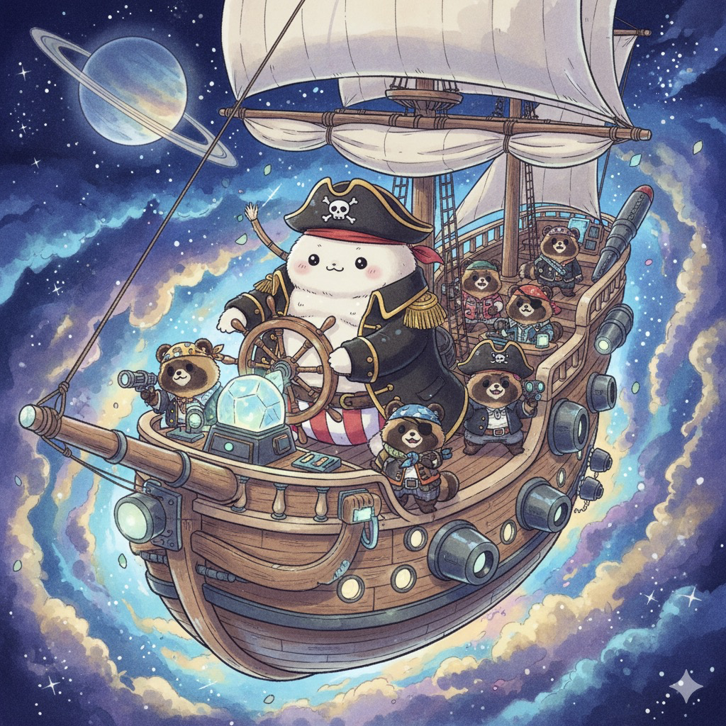 Instrumentation: Heavy down-tuned guitars with chunky riffs and metallic bass, Percussion blends war-toms, glitch beats, and pirate chant rhythms, layered with cosmic synth pads for interstellar depth, Rhythm: Mid-tempo with march-like drive, Chunkcore groove, IDM syncopation, and swinging Pirate Song accents, Mood: Heroic, wild, and mythic, yet playful and whimsical—a saga of spacefaring pirates seeking the legendary CANたま, Texture: Dense yet expansive, blending metallic distortion, glitch fragments, and echoing pirate chant motifs, Vocal: Tiny, high-pitched, very cute girl-like voice, Innocent and cheerful, delivering Pirate Song and CANたま phrases with playful charm, fully contrasting the heavy instrumentation, Production Notes: Emphasize percussive weight and cosmic reverb, Layer delicate harmonies and subtle vocal effects to enhance cuteness, Glitch breaks accentuate both chaos and playful energy