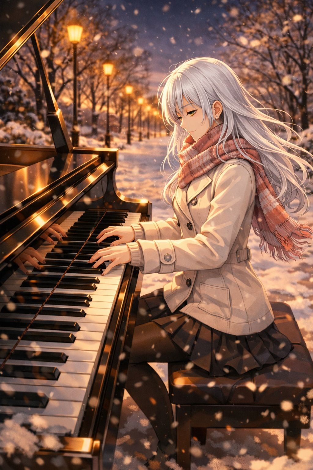 Processional dark martial dirge in 4/4, key E minor, solemn cinematic mood, Slow–moderate tempo, steady motion, Favor lower register;melodies mostly an octave lower for darker tone, Grand piano leads main themes instead of vocals;other instruments supportive, Advanced piano techniques:glissando, rapid keystrokes, repeated notes, expressive dynamics, occasional grand piano duet passages, Structure:Intro(drum cadence, distant bell, low strings, soft piano entry)→Verse(low-brass ostinato, staccato violas/cellos, piano motif)→Bridge(gradual crescendo with sustained strings, horns, woodwinds subordinate to piano)→Finale(full orchestral support, long decay, piano resolving theme), Instrumentation:grand piano dominant;bass drum, field snare rolls, cymbals, trombones/tuba dotted rhythms, low horns, sustained low strings, woodwinds support, timpani swells, subtle church organ pedal, Traditional acoustic orchestral scoring, Mix narrow stereo, natural hall reverb, slight tape warmth, Avoid synths, guitars, electronics, vocals