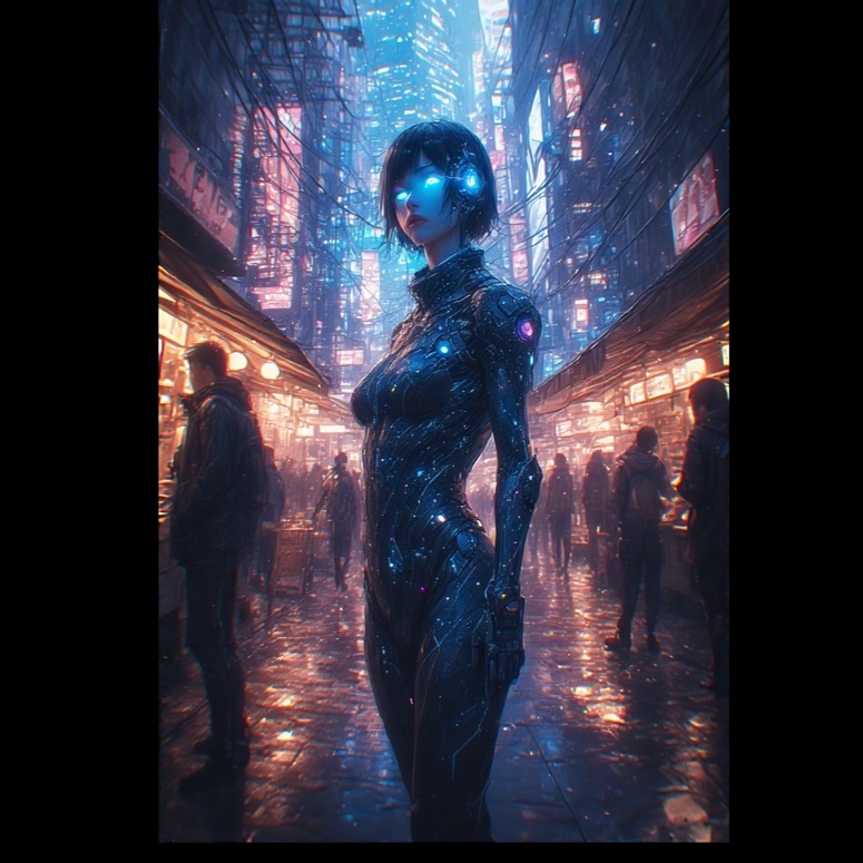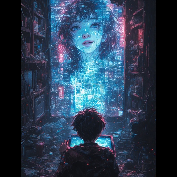[theme: digital awakening, interconnectedness, hopeful future, energetic, evolving, technological sublime, artificial consciousness, data flow]