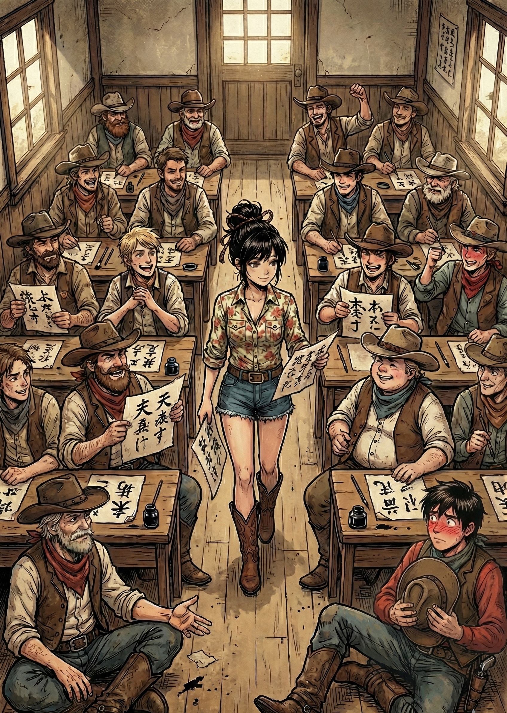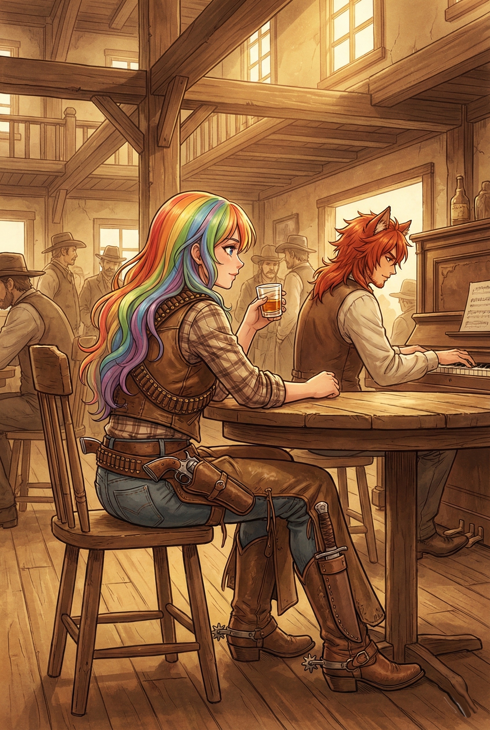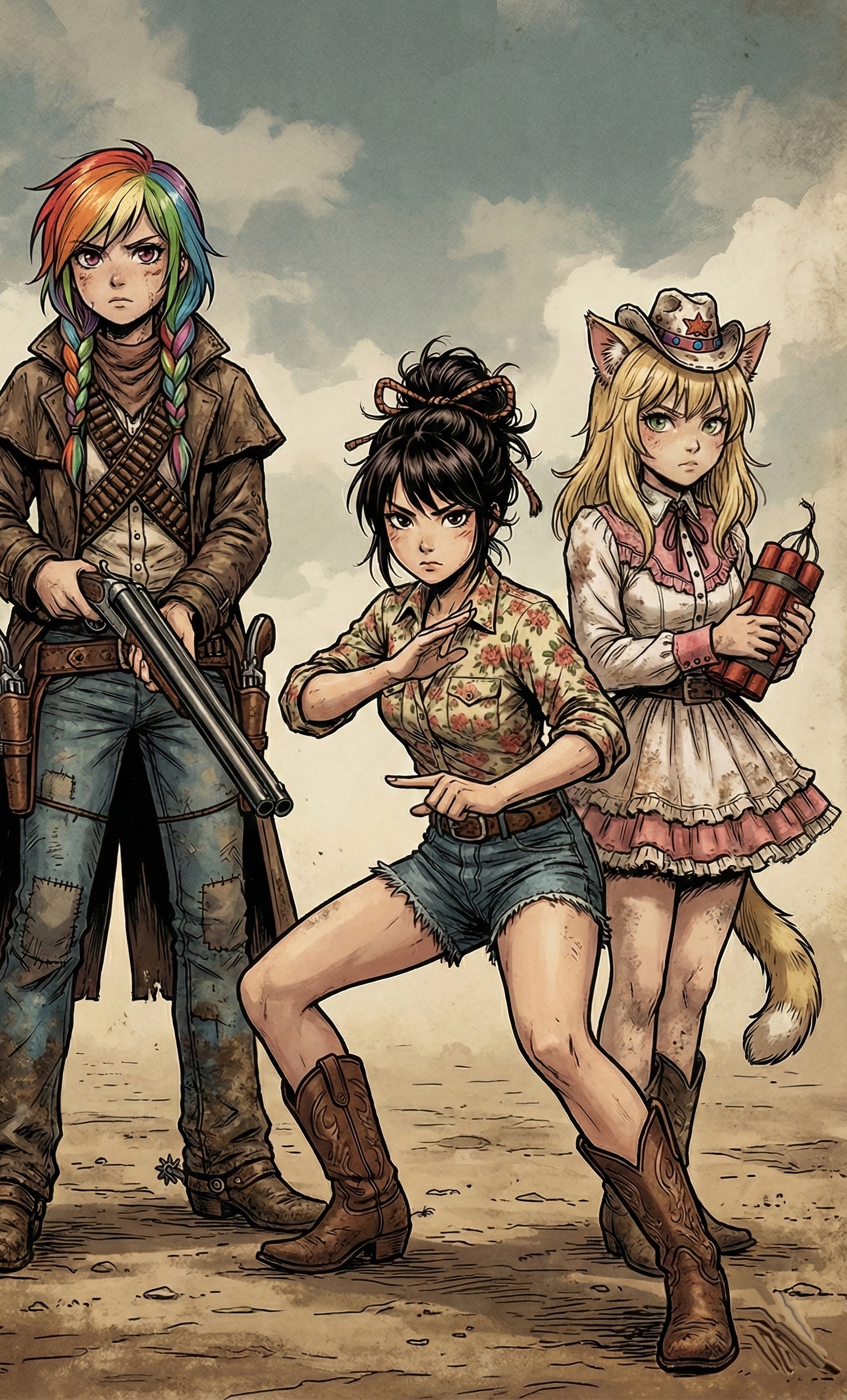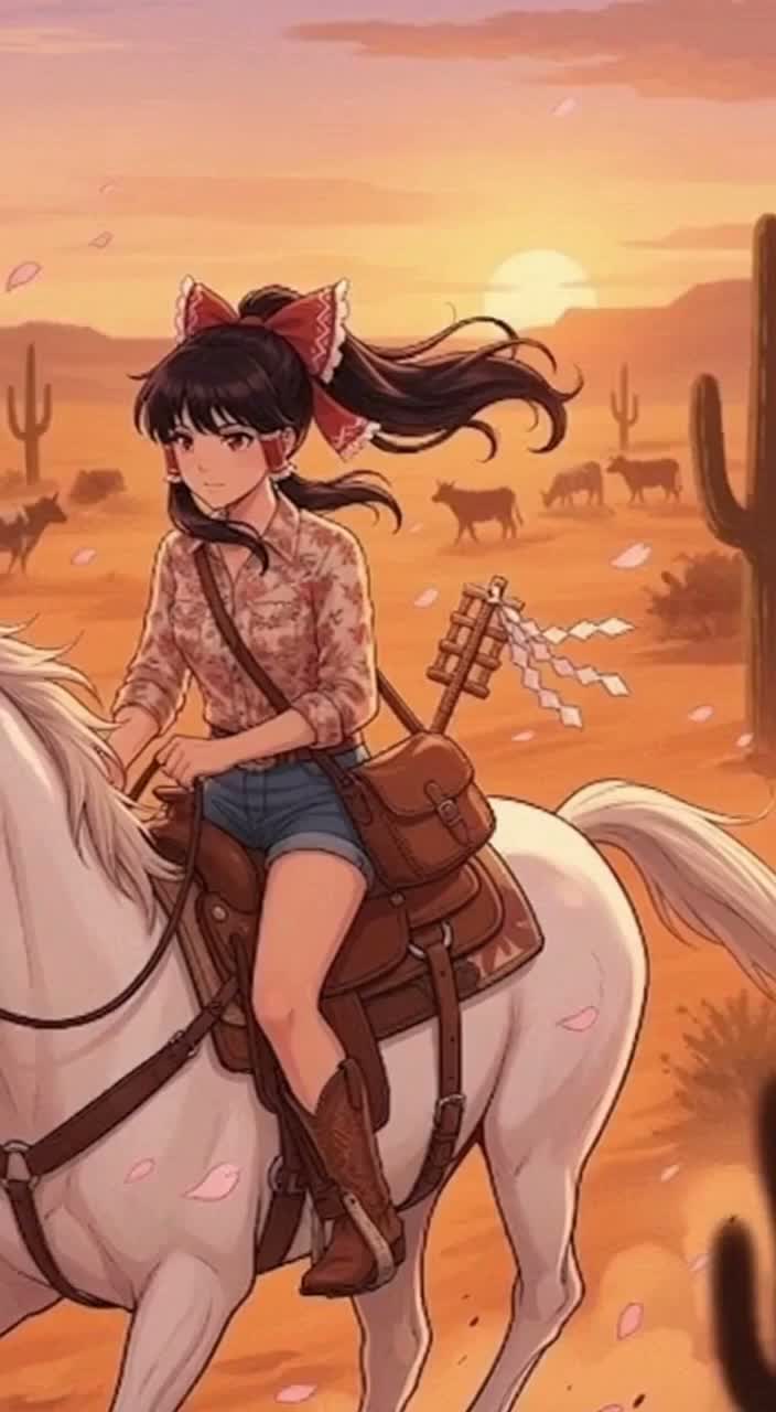 The song would be built around a classic, nylon-string acoustic guitar, playing that steady, shuffling, almost galloping rhythm that is the absolute hallmark of his gunfighter ballads, The Melody: Instead of synths, the main melodic instrument would still be the saloon piano, but it would be played cleanly and clearly, It would take the place of the lead guitar from a song like "El Paso, " playing those beautiful, slightly Spanish-influenced melodic lines between vocal phrases, The Vocals: Aya's lead vocal would be much clearer and more direct—less reverb, with the focus on telling the story, The real magic would be in the backing vocals, Emi and Yuki would act as the classic "cowboy chorus, " providing those tight, close harmonies that sound like a lonely wind sweeping across the plains, The Rhythm Sect