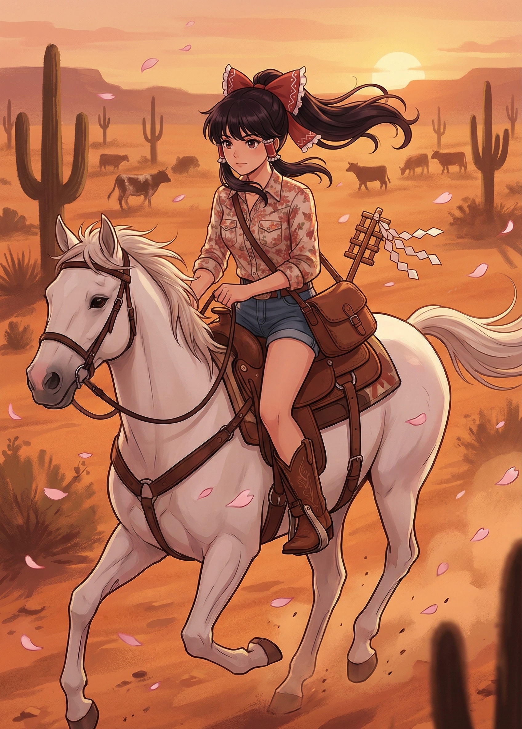 1960's Country Story Ballad, Emi's song is a gentle, introspective Cowboy Ballad, The arrangement is built on a delicate, finger-picked nylon-string guitar, The verses that recall her life in Japan are accompanied by the faint, ethereal melody of a synthesized koto, creating a unique texture, Her lead vocal is soft and heartfelt, with the other girls providing distant, airy harmonies in the chorus, like a whisper on the wind, The rhythm is sparse, with a simple upright bass and lightly brushed snare, The chorus swells with a beautiful, weeping string section, giving it a cinematic and emotional lift that signifies her finding her new home on the prairie, The overall sound is a beautiful fusion of East and West, reflecting her journey and her "Miko's heart" in a cowgirl's world