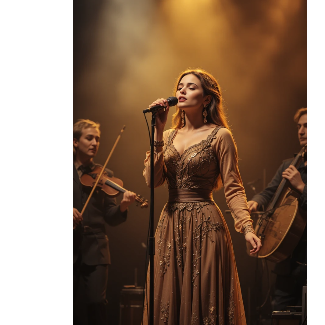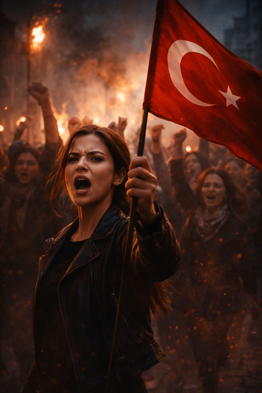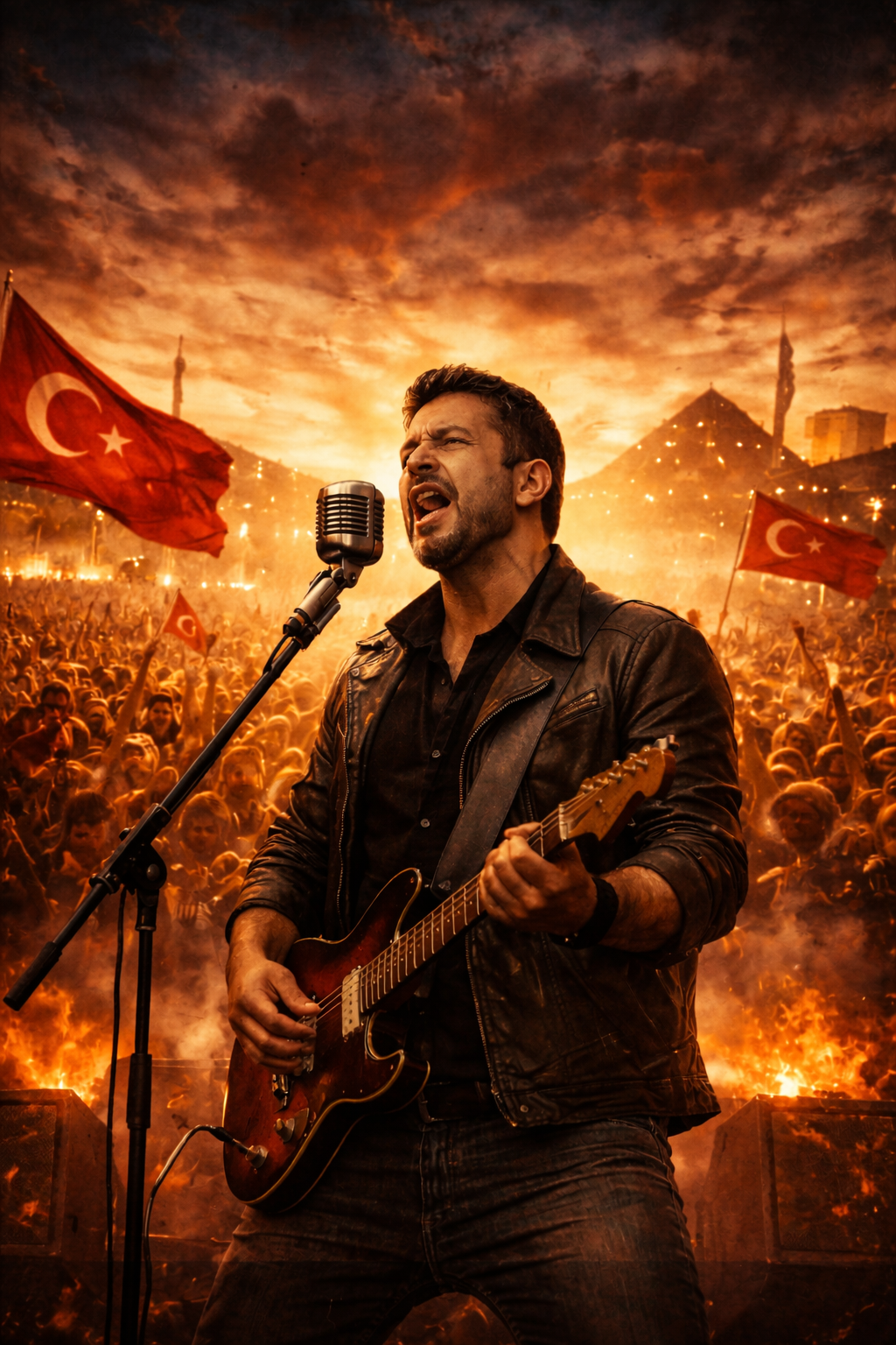 Turkish protest rock performed as a live concert recording, inspired by Anatolian folk-rock tradition, Strong female vocal, deep, clear, authoritative, emotionally charged, not raspy, Voice leads the crowd with conviction and dignity, Mid-tempo (90–105 BPM), Electric guitars with folk-rock character, clean to mildly overdriven, rhythmic and chant-friendly, Prominent bass, warm and steady, Live acoustic drums with a march-like groove, minimal fills, strong downbeats, Subtle bağlama spirit translated through guitar phrasing, Natural crowd ambience, light stage reverb, occasional audience response and clapping, Vocals front and center, spoken-sung intensity in verses, powerful unified choruses, No autotune, no studio polish, Raw, collective, timeless protest energy