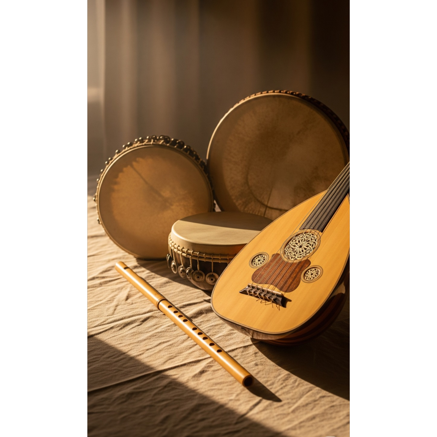 A spiritual Sufi-inspired song in Turkish begins with a gentle ney melody entwined with delicate oud arpeggios, Daf and bendir frame drums weave hypnotic, cyclical rhythms at a slow, meditative pace, Warm, expressive female vocals use subtle melismas, blending into the trance-like groove, The arrangement remains understated, gradually layering quiet drone textures, The song concludes with an ethereal instrumental outro, as ney and oud fade into deep silence, fostering a mystical, introspective aura
