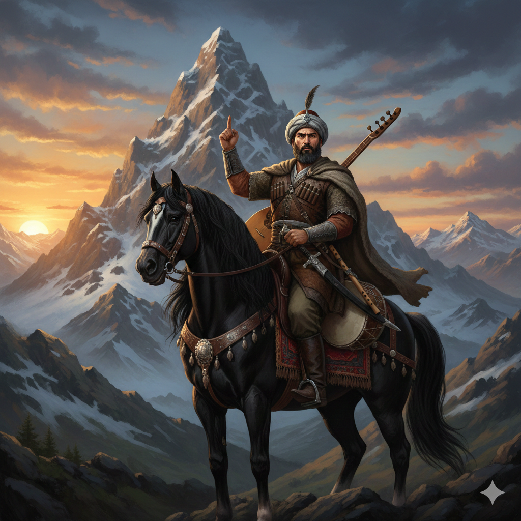 Style: Epic Turkish folk ballad with a steady, march-like rhythm in the style of Hasan Mutlucan, Proud, deep male voice with clear, rhythmic delivery, Tempo: Moderate-slow (72–80 BPM), in 4/4, Use traditional Turkish instruments only: bağlama (lead melody), davul (steady rhythm), kaval (optional), and subtle strings, No electronic sounds, The tone should be heroic and grounded, like a folk warrior's anthem echoing through the mountains, Language: Turkish