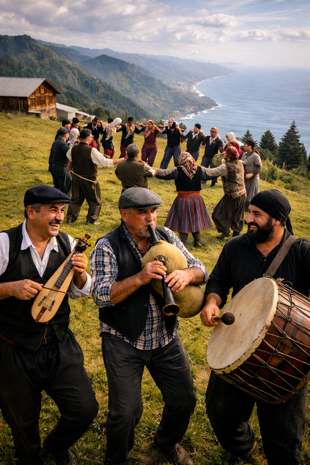 Bright kemençe leads with agile, ornamented melodies over a driving 6/8 horon rhythm, joined by spirited tulum and animated davul-tef patterns, Nasal male vocal, Black Sea accent, rides above; acoustic guitar colors the background, The bridge soars with group shouts and dynamic folk interplay, keeping the communal, energetic Karadeniz spirit alive through every chorus