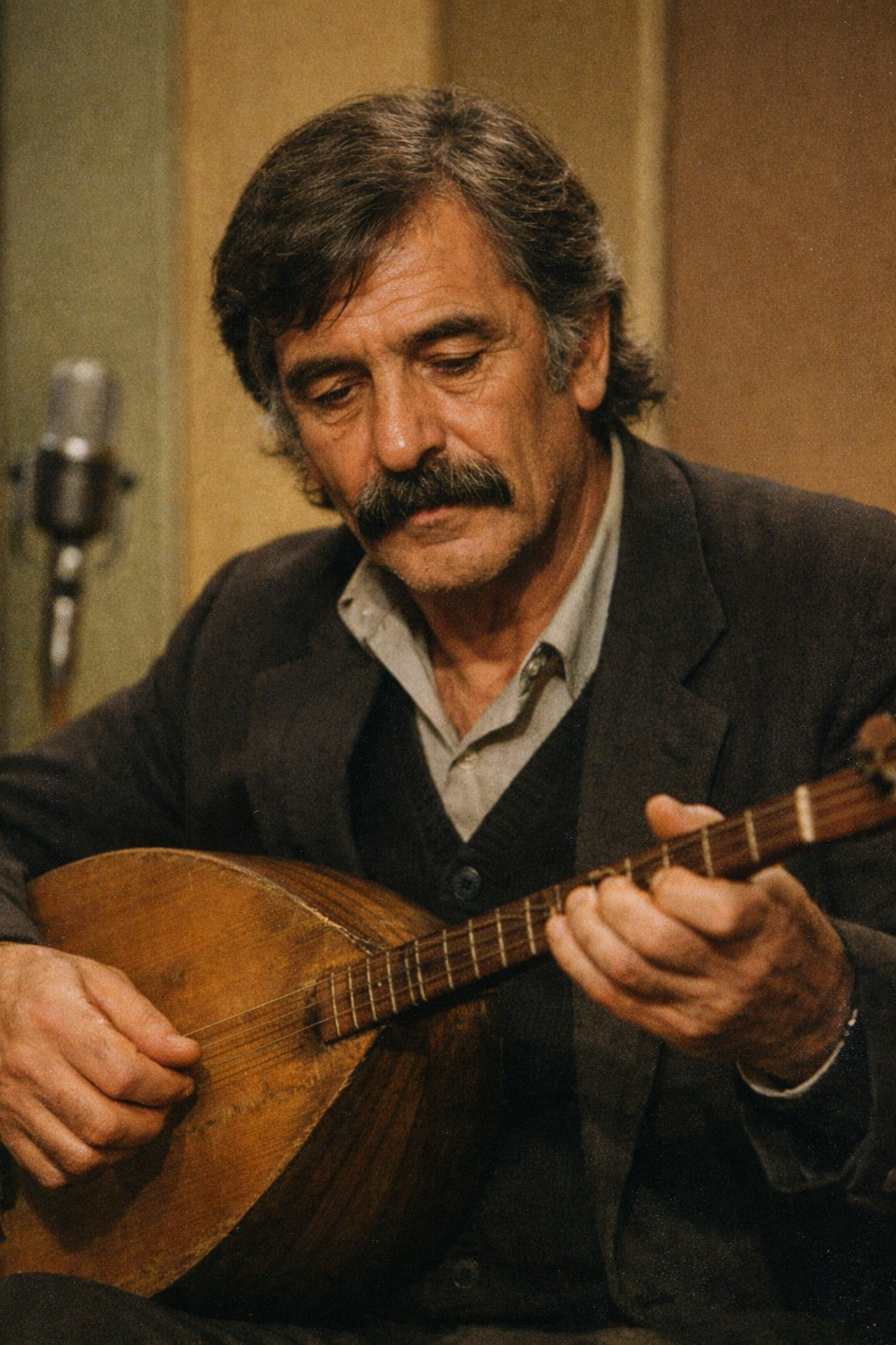 Deeply emotional Turkish arabesk ballad in the style of Ferdi Tayfur, Male solo vocal, warm, sorrowful, full of vibrato and raw passion, carrying pain and longing in every phrase, Singing is heartfelt, dramatic, and nostalgic, with clear Turkish arabesk pronunciation and ornamented phrasing, Instrumentation: bağlama (saz) arpeggios and tremolos, Turkish strings ensemble (violins, violas, cellos) playing melancholic lines, clarinet for soulful ornamentation, kanun and oud for texture, darbuka and soft frame drum for subtle rhythm, Tempo slow–moderate (70–80 BPM), in minor/Hicaz mode, with dramatic dynamic swells, Arrangement cinematic but intimate, evoking 1980s–1990s classic arabesk sound, with emotional instrumental interludes and long vocal sustain, Mood: sorrowful, hopeless, nostalgic, yet poetic