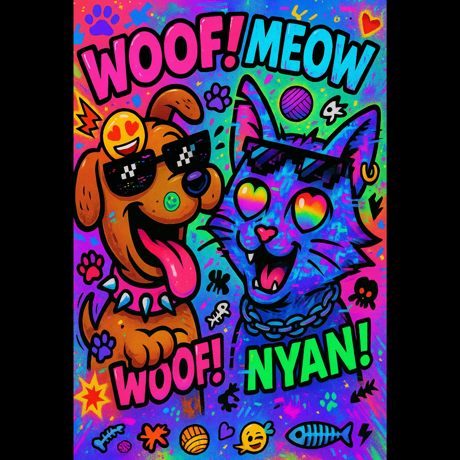 This hyperpop track races at a frenetic tempo: overcompressed digital drums clash with sharp, glassy synth stabs in wild bursts, Raw, unprocessed barks and meows alternate as lead “vocals, ” creating jagged melodies, The arrangement jolts between sudden drops and frenzied peaks, always maximalist and euphoric, with purely natural animal sounds driving the energy, ‑male
