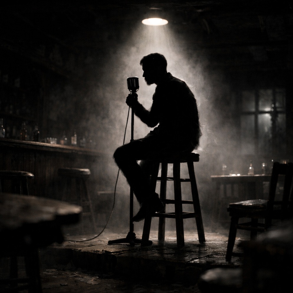 Atmospheric Swamp Ballad, Dark Gothic Americana, Minimalist Blues, Instrumentation: Low-tuned acoustic guitar with heavy reverb, hollow wooden percussion, slow throbbing 808 bass, distant lonesome harmonica, crickets and night-noise texture, Tempo: 65 BPM (Slow and heavy), Vocals: Gritty, tired Baritone, gravelly whispers, soulful exhaustion, Vibe: Claustrophobic, haunted, still, weary